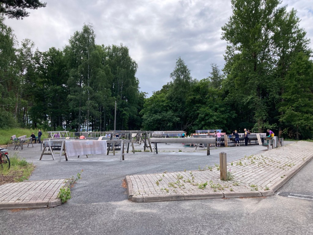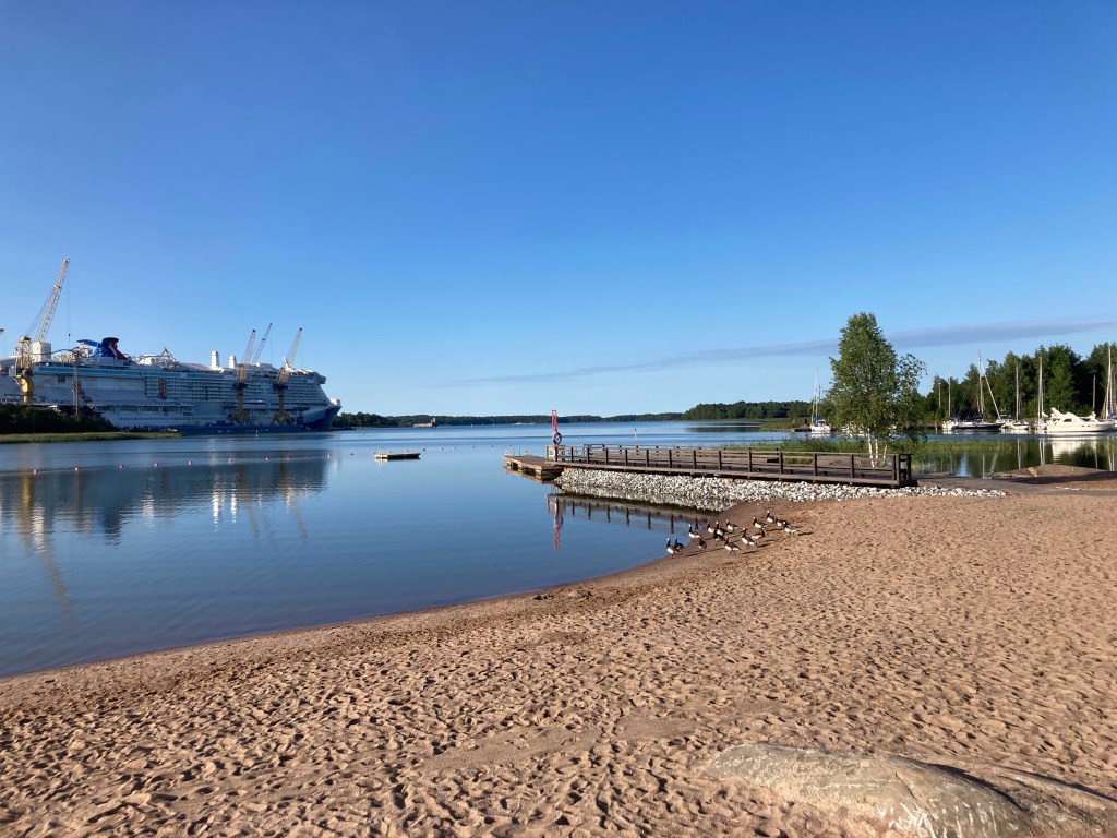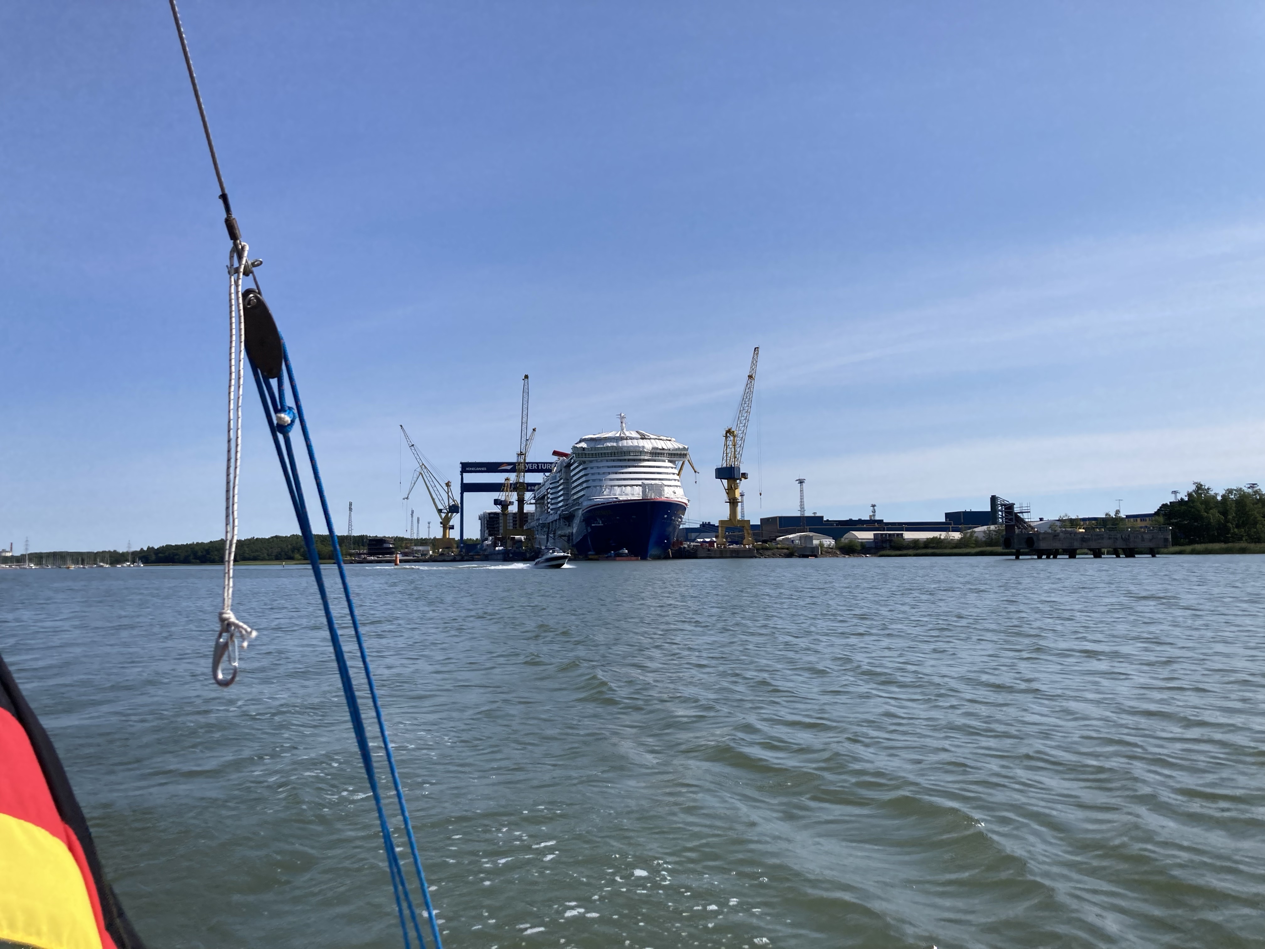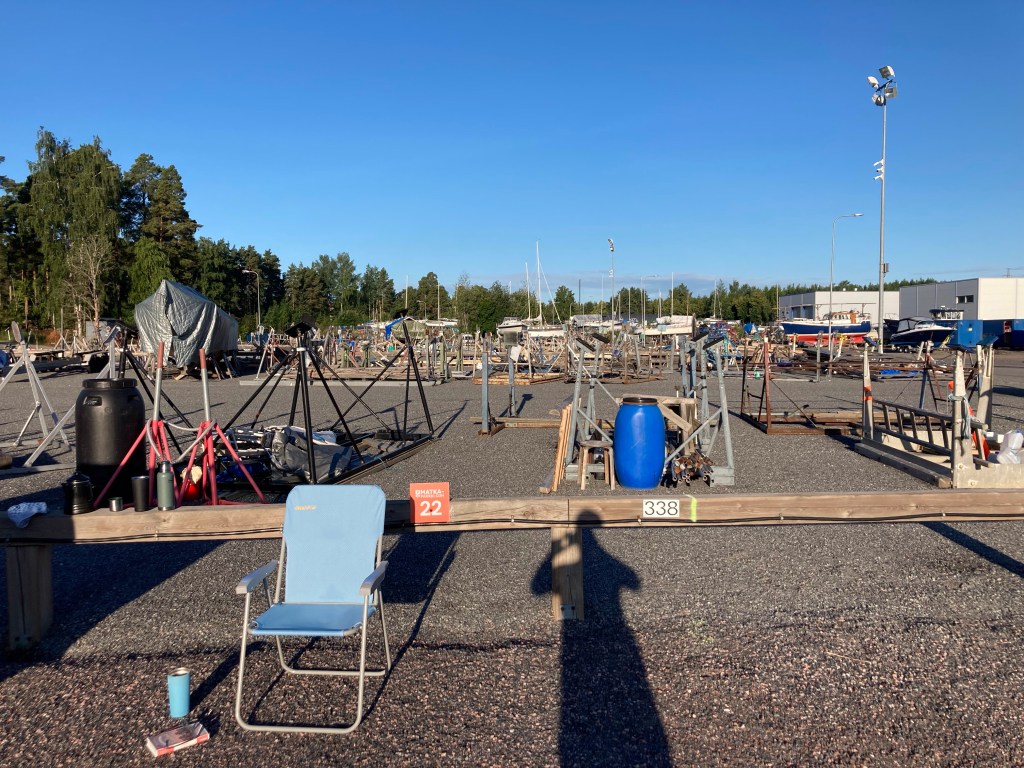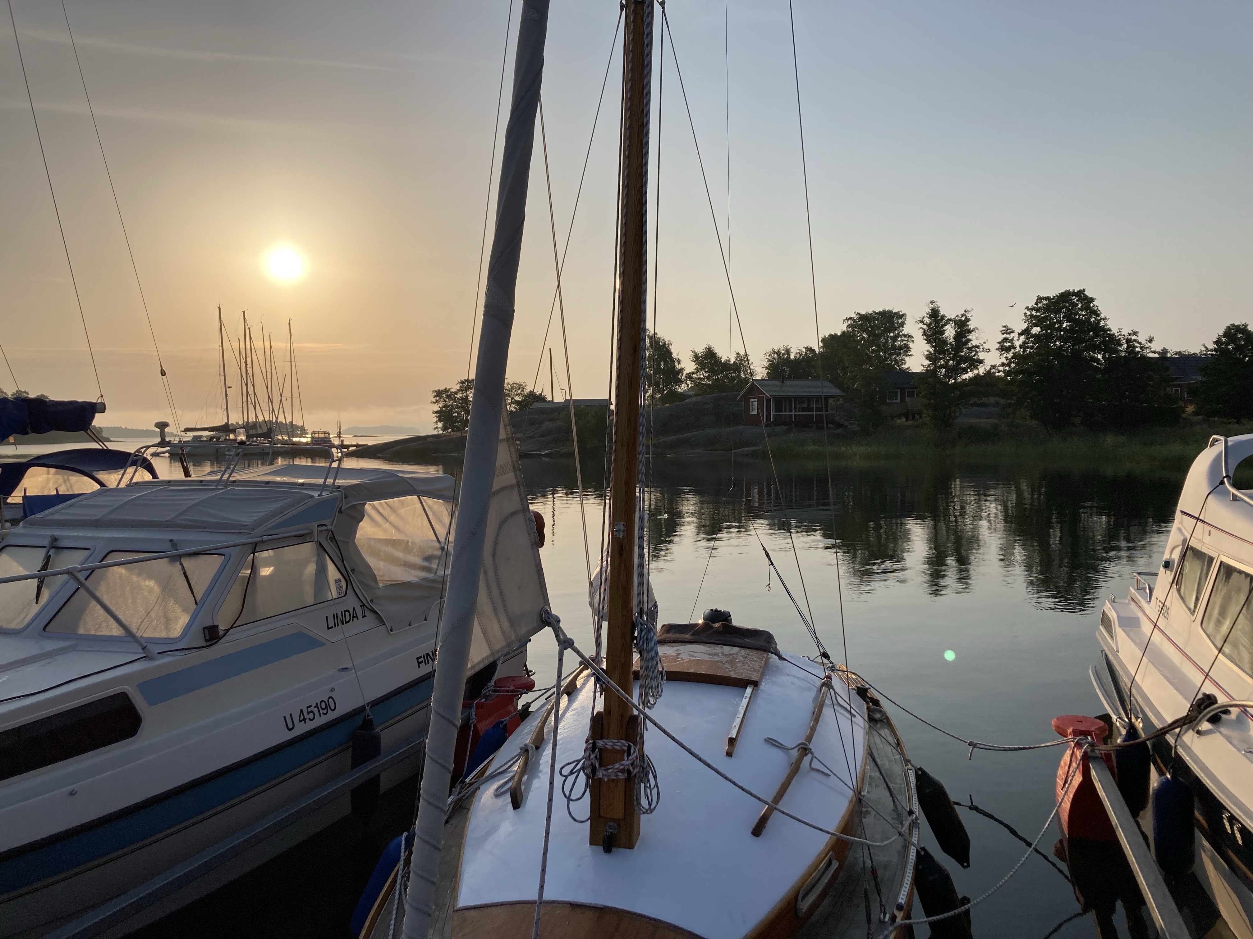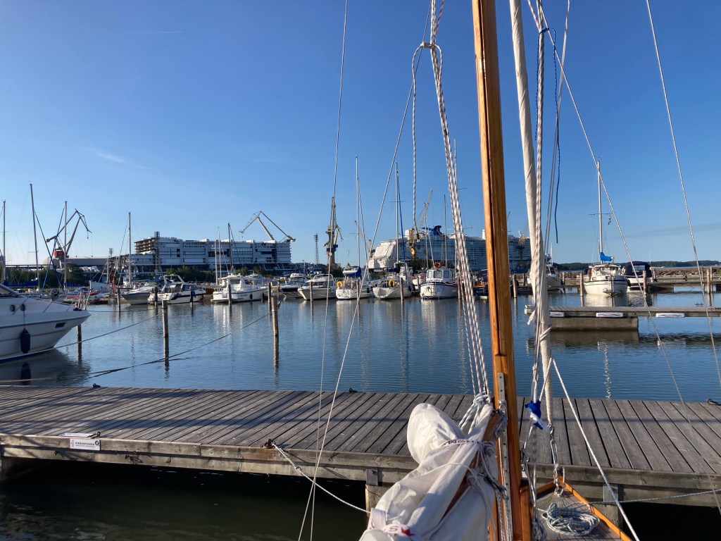 Mit der Fähre abends in Turku angekommen verlagern wir uns an den wenige Kilometer entfernten Yachthafen von Raisio – ein Hafen mit eher speziellem Charme: viel Platz für Boote im Wasser und an Land, sehr verkehrsgünstig gelegen (wer weiß, wo wir das Boot rausholen), mit Yachtausrüster, Blick auf die Meyer Werft, mit Naturwanderweg durch “typische Küstenlandschaft” vorbei an lost places (und ich sag noch: sieht aus wie in Estland, nur ohne verlassene Plattenbauten mitten im Nirgendwo – und siehe da: ein fast verlassener Plattenbau inkl. MC Howling Moons Clubgelände), einem typisch-finnisch öffentlichen Teppichwaschplatz und dem Playa del Raisio: mit Abendsonne und Morgenbaden. Einen ganzen Tag lassen wir uns Zeit, uns und “smågodis” segelklar zu machen – inkl. Einkaufstour lost in translation und drei Mal Mast setzen (einmal das Vorstag und einmal einen Zeiser oberhalb der 2. Saling vergessen – das übt ungemein). Nachmittags hat der Wind dann so zugenommen, dass wir uns gut auf einen strandnahen Gastliegeplatz einlassen mögen und faul sein dürfen: wir haben ja Zeit!