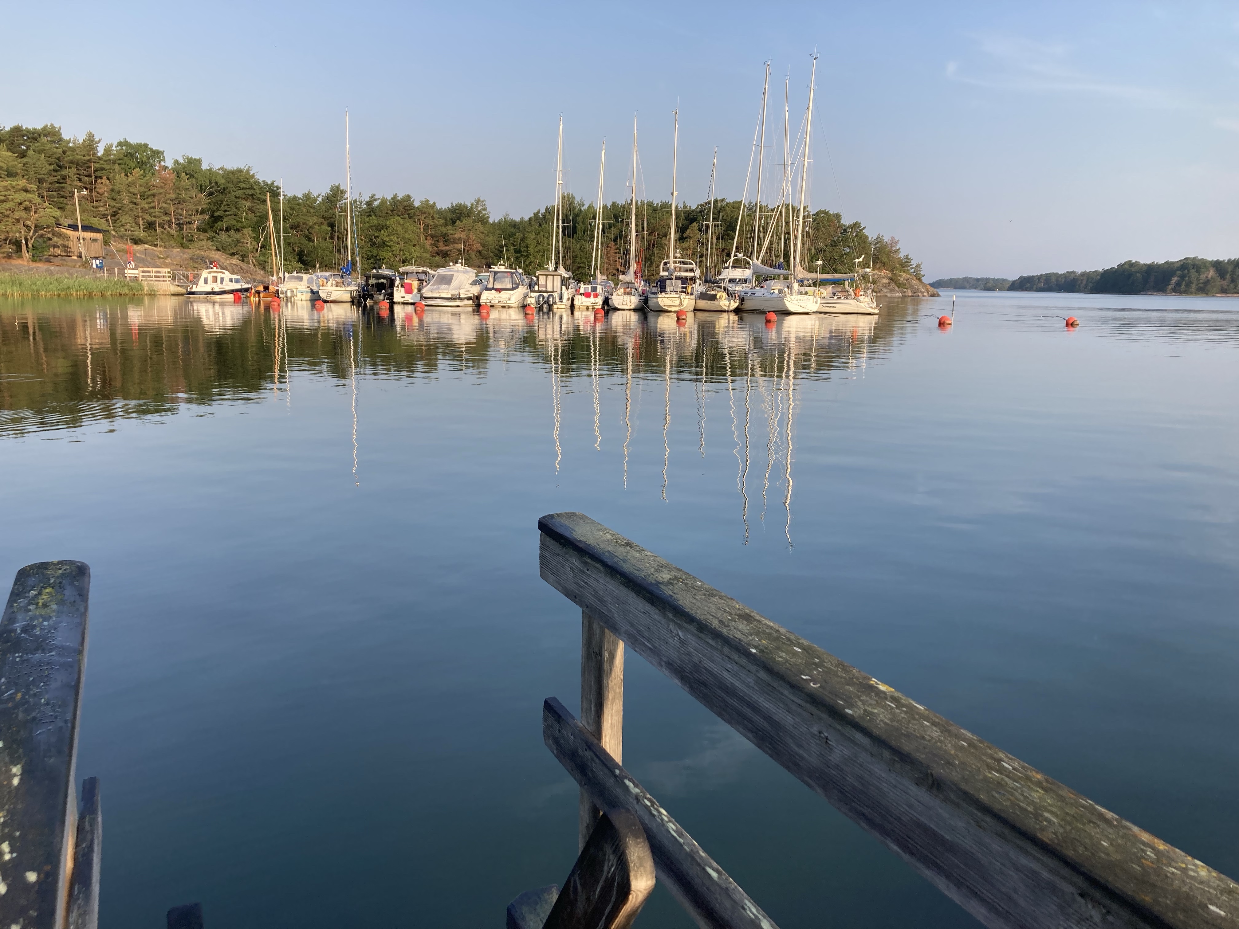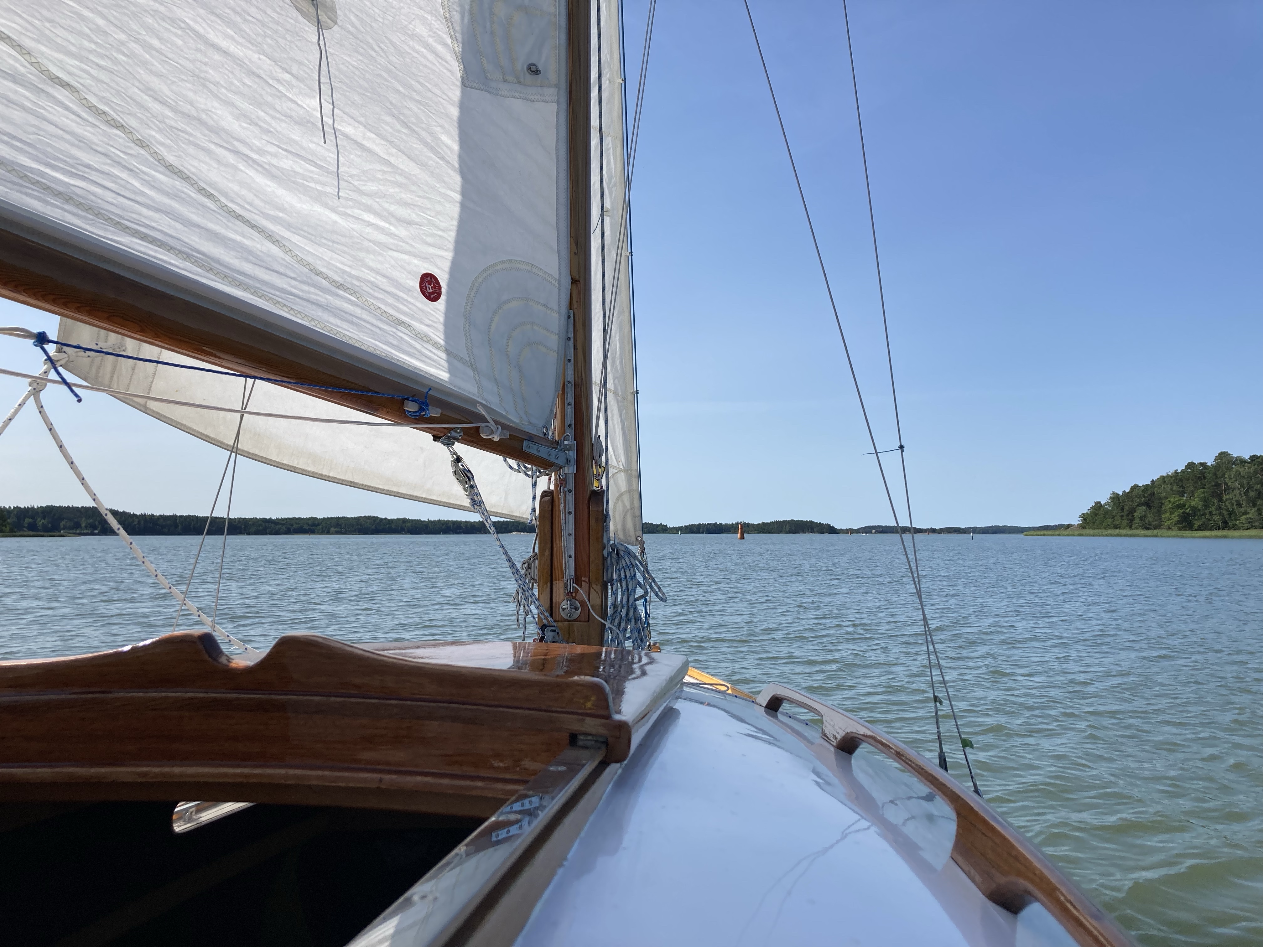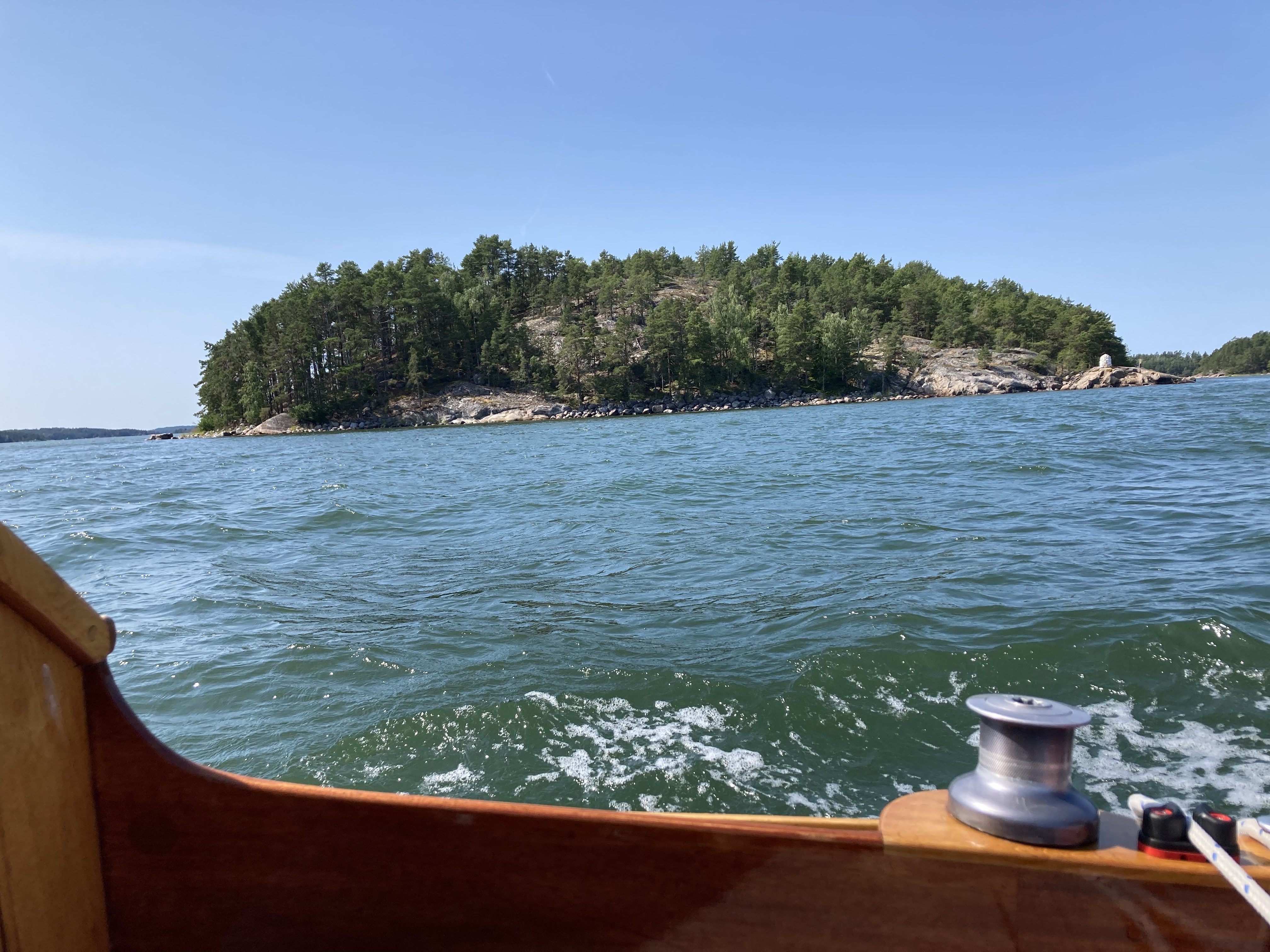 Am nächsten Morgen scheint die Sonne bei WNW 2-3 Bft – jetzt aber! Los! Raus! Nach Süden! Alles ist wasserdicht verpackt oder weg von der Bordwand und “zu oberst” gelegt, denn in unserem Eifer, uns zu Hause für ein Jahr überflüssig zu machen, hatten wir nicht genügend Zeit, das Boot vorzuwässern. Während Europa unter rekordheißen Tagen leidet, kurzehosesegeln wir den Airisto / Erstan mit Schrick in der Schot (auch ein Lebensmotto) entlang (W 3Bft) und nehmen Kurs auf den Örfjärden. Während uns bei der Passage eines schmalen Sundes mal fast der Wind wegbleibt, nimmt er “draußen” zu auf SW 4, so dass wir dort nach ein paar Kreuzschlägen das Groß wegnehmen und unter Fock nach Gullkrona einlaufen.