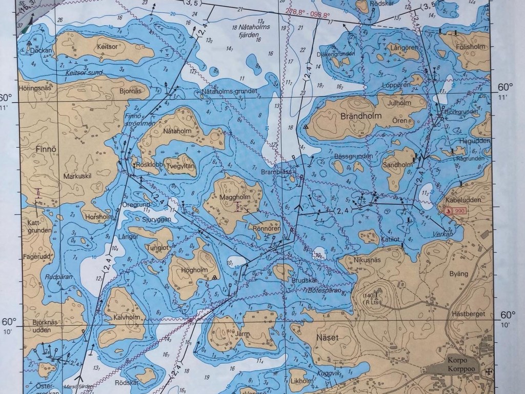Ein Blick auf die Seekarte lässt ahnen, dass das Segeln in den Schären eine Herausforderung sein kann – die für uns das Salz in der Suppe ist. Dass wir immer sehr genau wissen müssen, wo wir auf der Karte gerade sind, macht die Sache für uns nur interessant. Nebenbei ist Schärensegeln ja auch etwas Sightseeing: wir rauschen oder dümpeln vorbei an Dörfern, Häfen, Felsen, … und unzähligen Sommerhäusern. Anders als in Schweden scheint es in Finnland üblich, seine “mökki” hinter Bäumen versteckt und – wenn nicht finnisch-rot – in unauffälligen Farben zu streichen. Understatement? Weniger ist mehr? Gehört der Blick aufs Wasser durch Bäume hindurch zum mökki-Gefühl? Oft deuten nur zwei Liegestühle und ein Badesteg an, dass hier eine Sommerresdienz (Hütte plus Sauna) liegt.