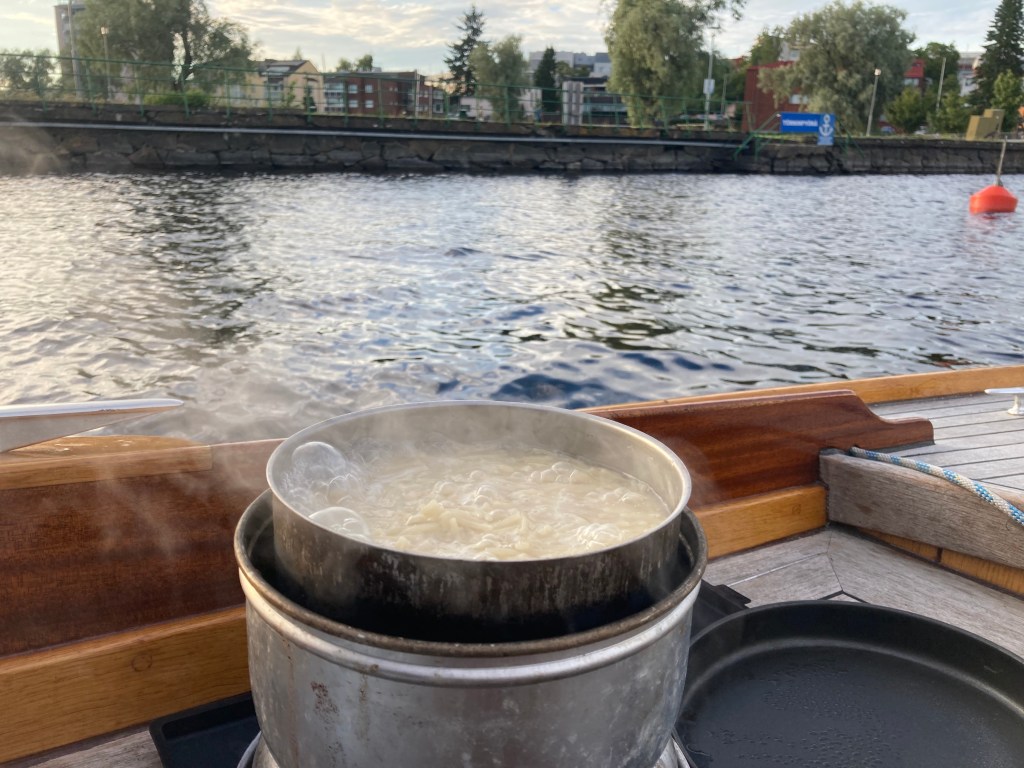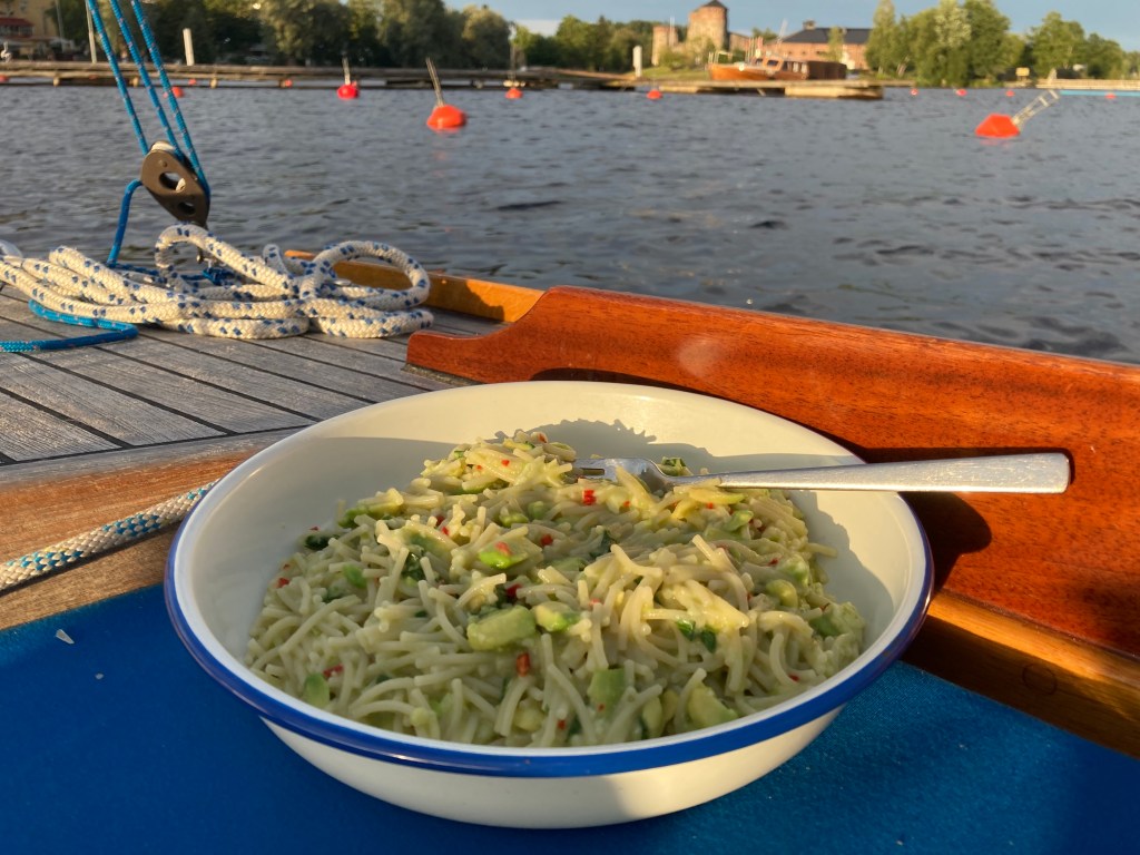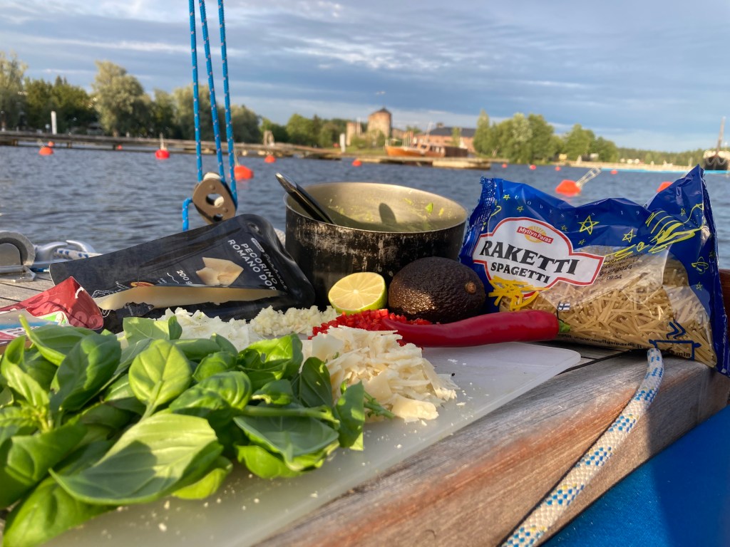 500g Spaghetti (da wir in unserer Bordküche nur einen ca. 3 l fassenden Topf haben, haben wir die finnische Raketti genommen, die sind ähnlich wie Spaghetti nur kürzer und lassen sich besser in dem kleinen Topf kochen. Natürlich sind alle Sorten Nudeln geeignet)