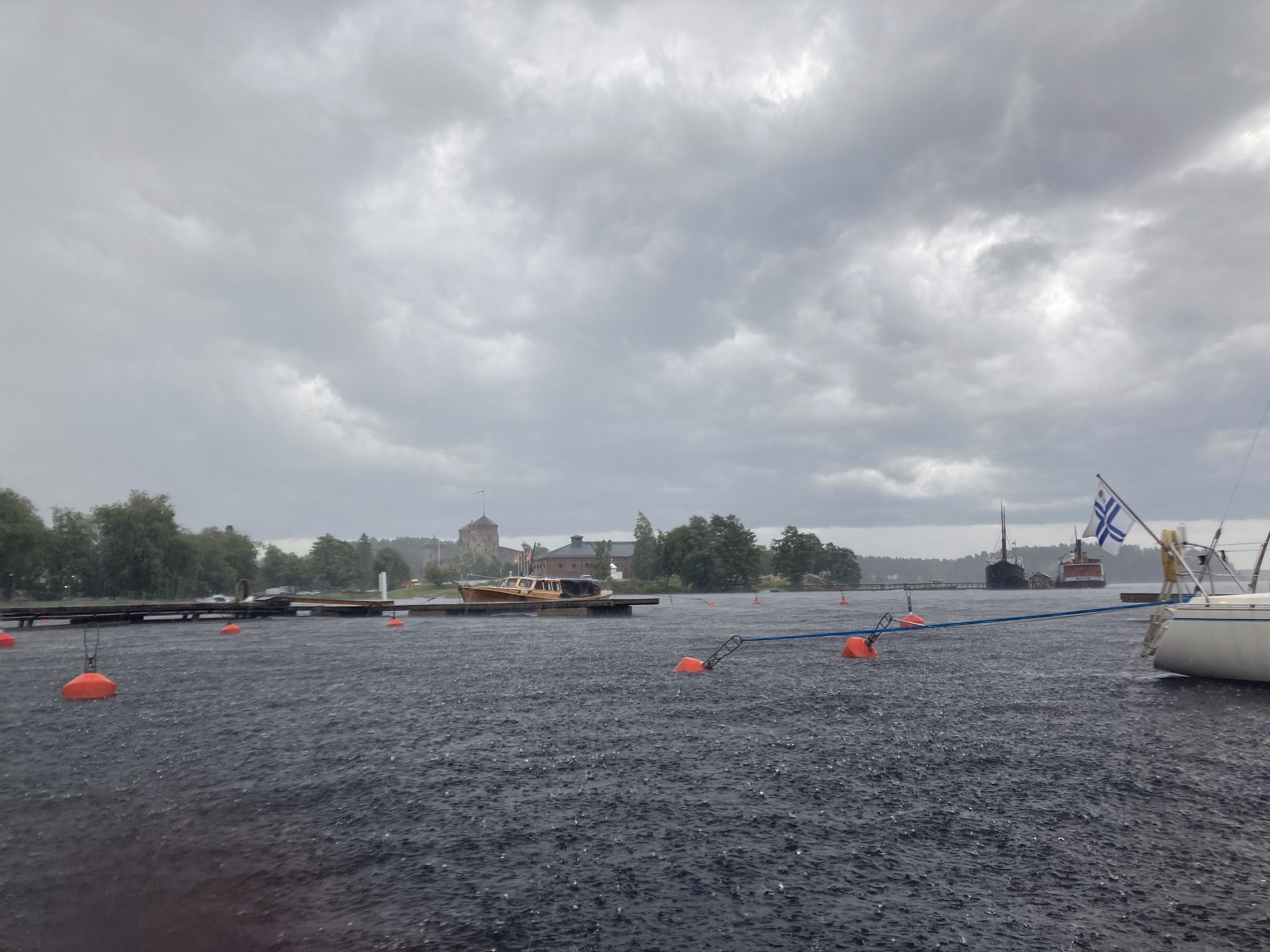 (*) Wir haben einen Termin – im Sabbatjahr! Nämlich Konzertkarten für Apocalyptica! In Finnland! In der Olavinlinna, einer der ältesten Burgen des Nordens! Zum Glück macht uns der Termin keinen Stress – ein paar Stunden vor Konzertbeginn laufen wir nach 15sm Kaffeesegeln in Savonlinna ein. Auf dem Weg sehen wir unsere erste Saimaa-Ringelrobbe – leider hält sie nicht still fürs Beweisfoto. Der Gästesteg mit perfekter Aussicht auf Burg, Stadt und Bucht erweist sich als sehr unruhig: Schwell durch Wind (von dem wir hier zum Teil reichlich haben) inkl. Gewitter und den regen Verkehr der Ausflugsboote machen Lust auf ruhige Buchten – nach unserer Kulturrunde in Savonlinna.