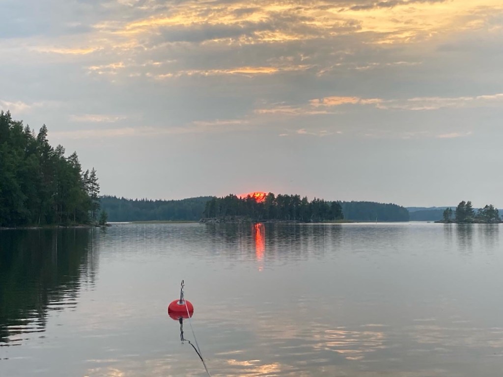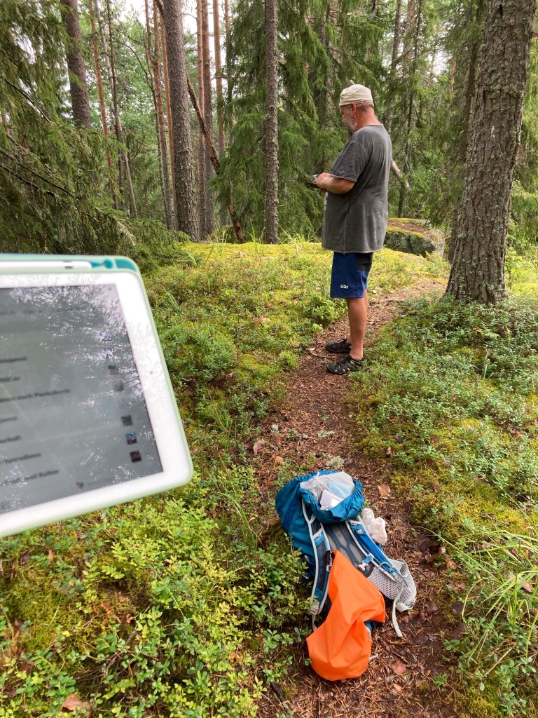 Am nächsten Tag sind nur schwache, südliche Winde angesagt. So kommen wir hier nicht raus! Und weiter wollen wir auch nicht, denn uns haben die wenigen Passagen hierher, die nur unter Motor möglich waren, schon gereicht. Auf dem Weg nach Kuopio würden uns viele Kanal(ähnliche)Passagen erwarten – ohne Wind. Also bleiben wir einen Tag hier. Nach einem kurzen Schauer (Regen? Wie bitte?) machen wir uns auf die Rundwanderung. Gute 2 Stunden mit vielen Höhenmetern, ein bisschen Netz zum erhofften Hochladen unserer Regenpausen-Ergebnisse und massenhaft Blaubeeren durch die vielen „Klimazonen“ eines finnischen (Ur)Waldes. Hochsommerliche Frage zum Ende: erst was trinken oder erst baden?