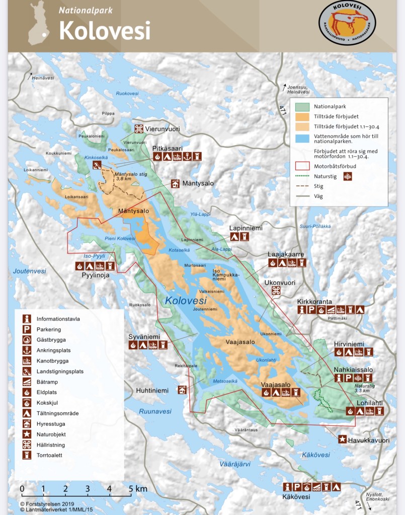 Der Kolovesi NP https://www.utinaturen.fi/kolovesi ist eine unter Saimaa-Ringelrobben sehr beliebte Ecke – und soll eben diesen einen geschützen Raum geben. Im Winter ist das Betreten und Befahren des NP komplett verboten, im Sommer in weiten Teil das Befahren mit Motorbooten. Auch mit unserem 3,5PS-Freddy ist uns so nur die Nordwestecke des NP zugänglich (auch wenn wir unter Segeln einen kleinen Schlenker rein machen könnten). Für Paddler bietet der NP einen 3-4-Tage-Rundkurs, Lagerplätze und viel Ruhe (wo schon im Hauptfahrwasser nix los ist).
