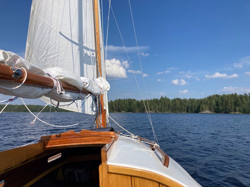Am zweiten Morgen machen wir uns früh auf den Weg zurück Richtung Haukivesi. Der Südostwind soll ab Mittag auffrischen, aber noch haben wir perfekte Bedingungen (2-3 Bft, Sonne), um mit einem perfekten Boot einen Großteil des Heinävedenselkä aufzukreuzen. Als der Segelspaß in Arbeit umschlägt (ab böigen 3-4 Bft die Großschot immer zur Hand), machen wir auf Pieni Parkinsaari fest. Zeit zum Baden, Lesen, (kalt) Kochen.