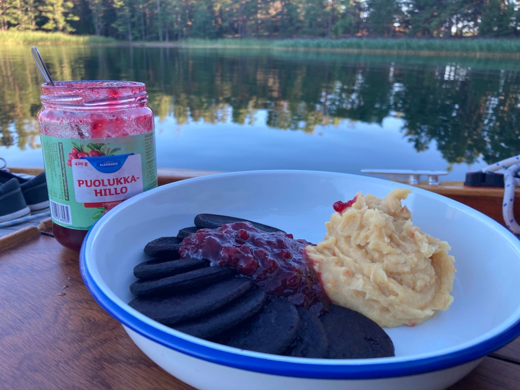Zubereiten kann man die Mustamakkara in der Pfanne, im Backofen oder auf dem Grill. Gegessen wird sie mit reichlich „skandinavischem Ketchup“ der Preiselbeermarmelade (Poulukkahillo, Lignonsylt), einem Glas Milch und einem Stück Brot/ Donut als Snack. Wir haben die Variante mit Kartoffelsalat als vollständiges Abendbrot gehabt, geht auch.