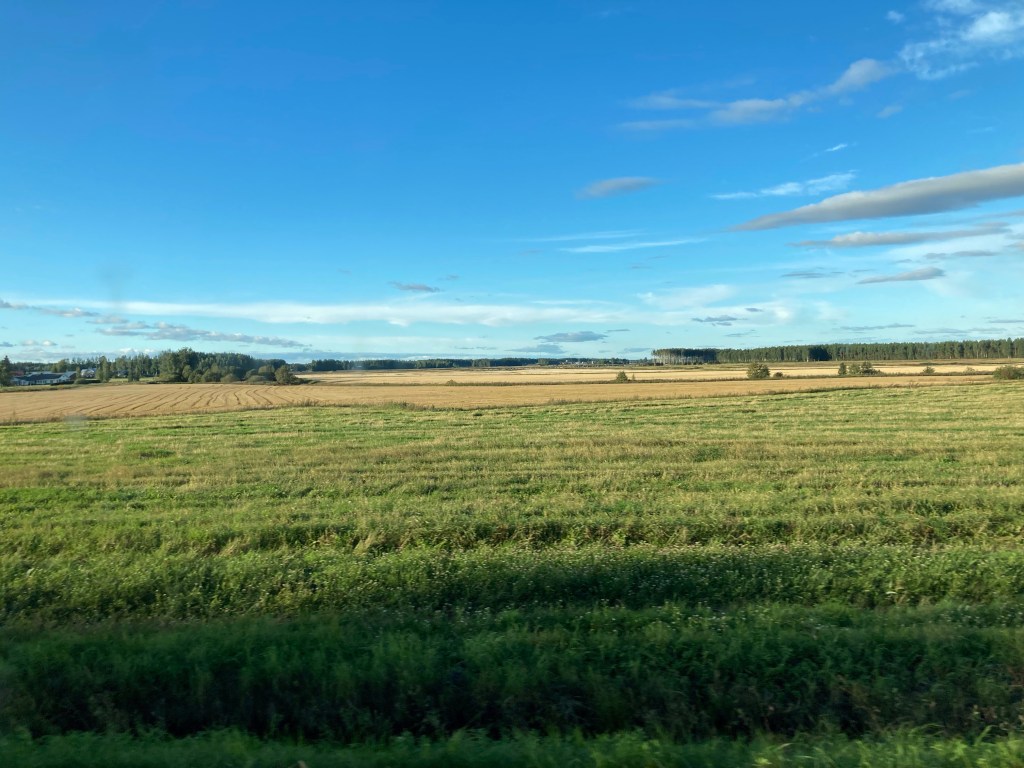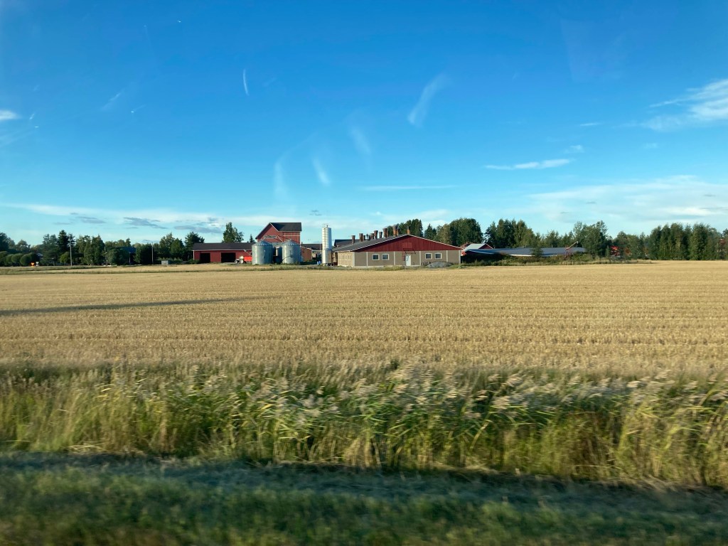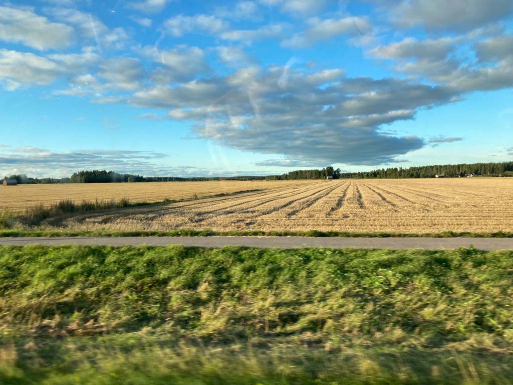Den frühen Abend widmen wir der Durchquerung des „mittleren Westens“ Finnlands. Nach Forstwirtschaft, Monokultur in rechtwinkligen Waldstückchen in unterschiedlicher Höhe, bietet die Gegend östlich von Vaasa ein etwas trostloses, landwirtschaftliches Bild. Die Getreideernte ist in vollem Gange, die Landschaft konsequent flach und weit, die Höfe schmucklos und zweckmäßig: hohe Getreidesilos, lieblos dahingeworfene Scheunen und Ställe, nachlässig (dauerhaft?) abgestellte Nutzfahrzeuge. Sogar die Wohnhäuser und öffentliche und gewerbliche Gebäude strahlen Trostlosigkeit aus. Hier geht es um Ertrag, nicht um Schönheit.
