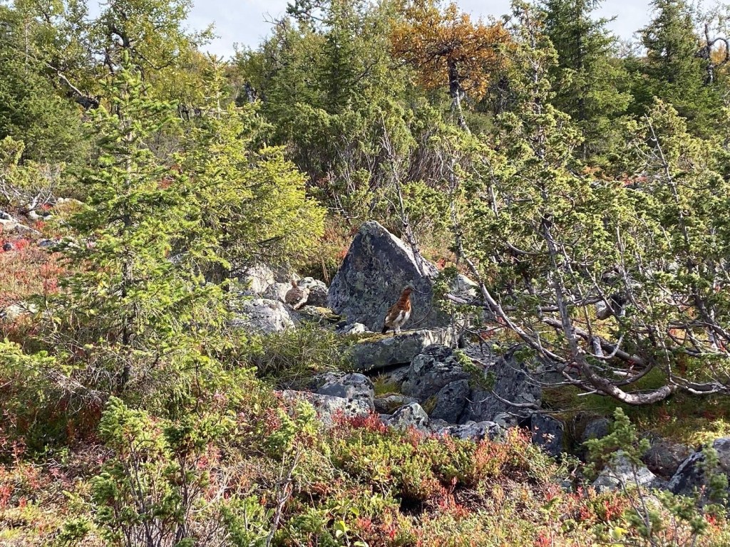 Am nächsten Morgen muss der Morgenkaffee die Kälte und den Nebel erstmal vertreiben. Aber dann dümpeln wir morgensonnig den gleichen Weg wieder zurück – wie schön, dass die neue Blickrichtung auch mit neuen Eindrücken verbunden ist: neben Rentieren jetzt auch mal Schneehühner (fjällripor) im Herbstkleid.