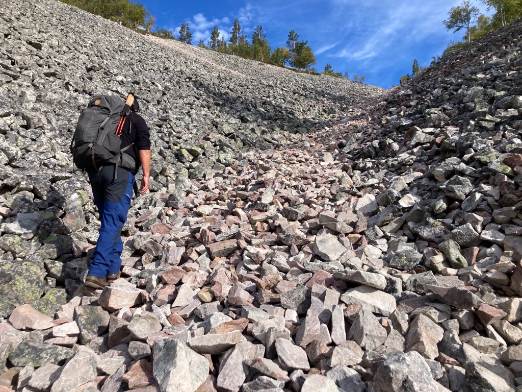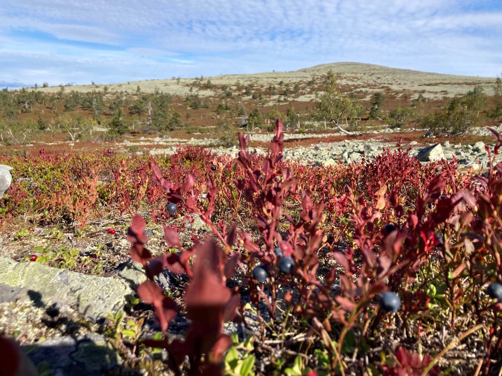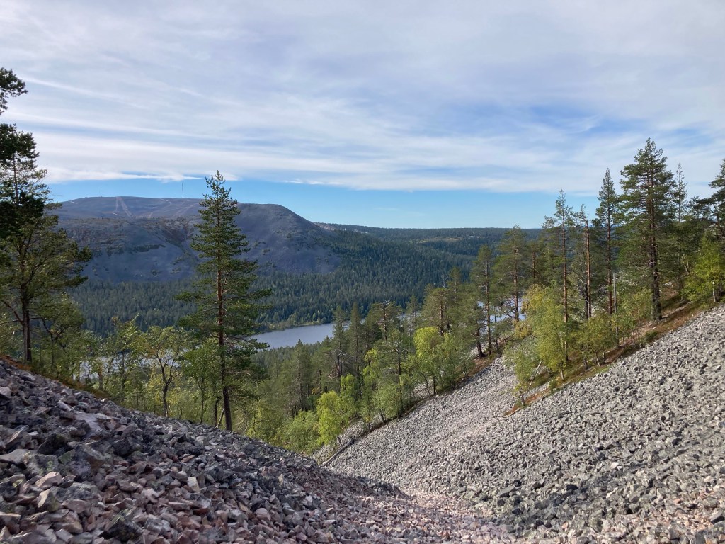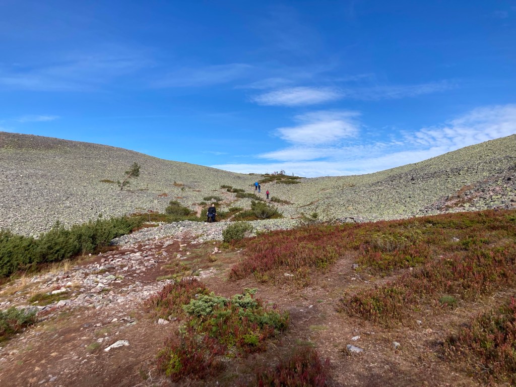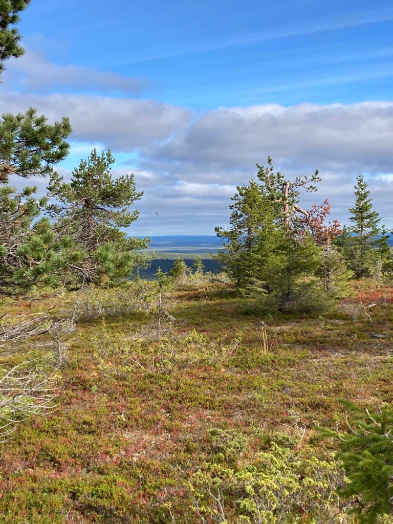 Ziemlich unvorbereitet waren wir froh, im NP-Info-Zentrum auf dem Ylläs eine wandertaugliche Karte zu erstehen, um erstmal auf Tagestouren unsere Höhenmeter-entwöhnten Seglerbeine auf Trab zu bringen. Ohne Ahnung, was hier die Highlights sind, folgten wir erstmal der Empfehlung der freundlichen Info-Mitarbeiterin: eine 10km-Runde im Yllästunturi über den Kesänki: viel begangen, mit einem steilen Aufstieg (besser als steiler Abstieg), Fernsicht sowie Kote, Feuerstelle und huussi für die Pause. Und über den Berg kein Radweg. Denn das merken wir sehr bald: in einer Gegend, in der man E-Fat-Bikes mieten kann, irritiert uns die friedliche Koexistenz der finnischen Fußgänger und Radfahrer auf ihren gemeinsamen Wegen (so wie sie auch in den Städten praktiziert wird) ein bisschen. Aber auch hier geht alles sehr rücksichtsvoll ab: dezentes Heranrollen statt Fahrradklingel. Südtirol-Feeling macht sich breit: zunächst ein voller Wanderparkplatz, auf dem sich viele andere Tageswanderer aufmachen, um entweder nach der 2km entfernten Einkehr (kahvi, munkki, makkara) den See zu umrunden, oder sich mit uns (meist uns überholend) an den Aufstieg zu machen. Dann die steile Geröllrinne, die uns an die viiieeel steilere und höhere Tour über die Scharte zur Ifingerhütte erinnert. Schließlich sanfte Hänge mit lockerer Baumgrenzen-Botanik: ein bisschen Salten in Lappland. Fazit: toller Einstieg! Wer die nordische Einsamkeit sucht, sollte nicht in der Hauptsaison den beliebtesten NP Finnlands aufsuchen. Aber im Vergleich mit Südtirol ist es dennoch leer. Weitere Zutaten: Sonne und Blau-, Preißel- und Krähenbeeren als fast ständige Begleiter.