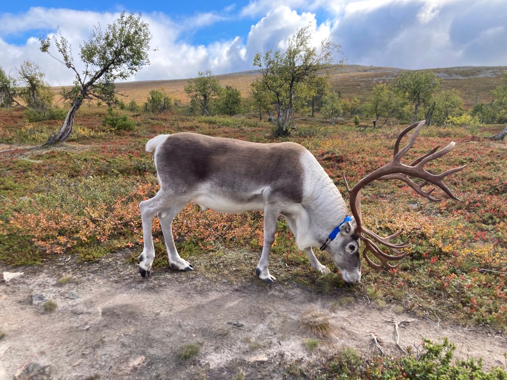Für die nächste Tagestour nehmen wir Kurs auf das Pallastunturi. Gute 8 km über den sonnig-schaurigen Palkaskero genießen wir großartige Aussichten, ein gelassenes Rentier im Weg, einen gerölligen Gipfel (Riesengebirgs-Feeling) und ein Abstieg vorbei an einem Rentierscheideplatz (erotuspaikka ist nix Unanständiges). Zum Abschluss des Tages gönnen wir uns den Campingplatz Harriniva direkt am Flussufer bei Muonio: mit Hotel-Sauna, warmem Abwaschwasser in der Sommerküche und Kote, in der wir lange am Feuer sitzen, kochen, lesen und schreiben können: die Nacht wird fast-frostig kalt.
