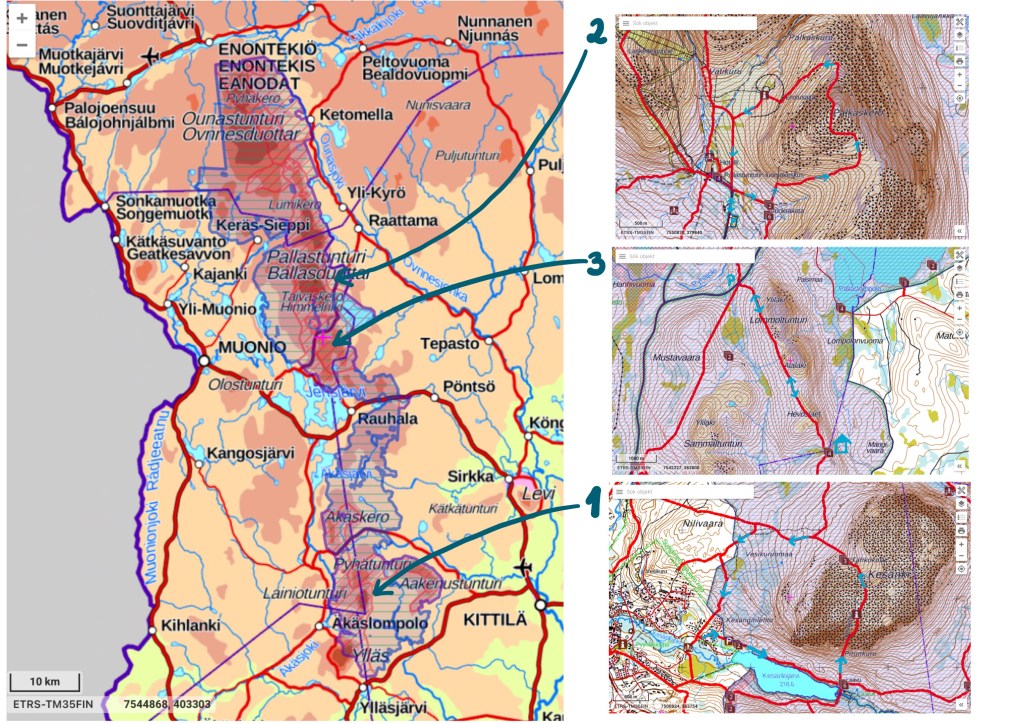 An der finnischen Küsten hoch bis an das obere Ende der Ostsee getrödelt wollten wir nun endlich ins Fjäll, auf irgendein tunturi. Das beste (oder am wenigsten garstige) Wetter war für den Nationalpark um das Ylläs- und Pallas-Tunturi (tunturi = fjäll = baumgrenzenhoher Berg) angesagt. Die Tunturit dieses NPs liegen als Höhenrücken in einer sonst eher flachen finnischen Wald- und Moorlandschaft. Die Geographie verspricht Fernsichten und Weitblicke. Der NP teilt sich grob in drei Teile: Ylläs-, Pallas- und Ounas-Tunturit: dem Höhenzug folgt auch ein längerer Wanderweg – die ersten gut 50 km ab Hetta (im Norden) sind wohl ein Klassiker. Wir unternehmen hier zwei Tagestouren (1+2) und eine kleine Wanderung mit Übernachtung (3).
