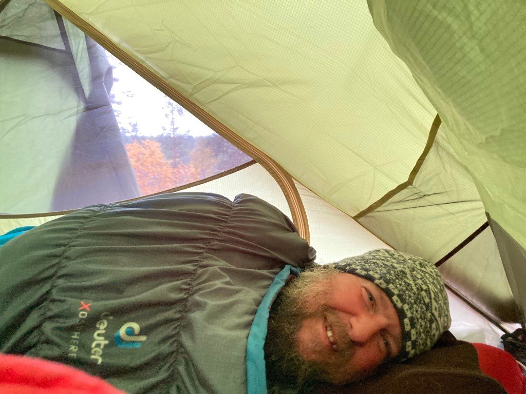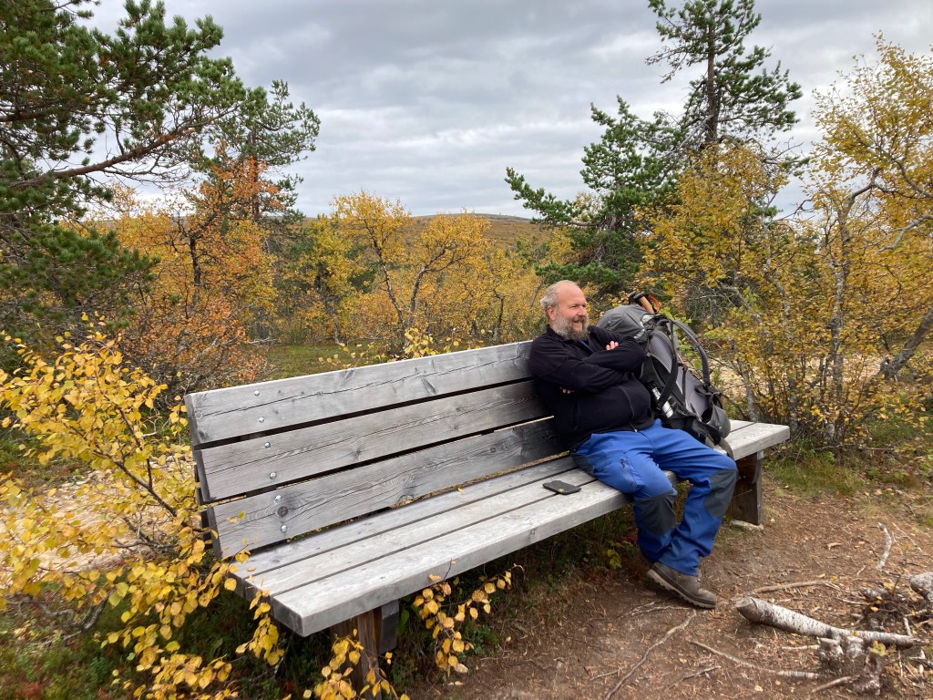 Am Morgen versammeln wir uns wieder mit Kaffeekessel und Müslischale ums Lagerfeuer. Viele haben heute den Plan, an der Tuiskukuruhütte (14km) vorbeizulaufen bis ins nächste Tal, denn die Luirojärvi-Hütte(+7km) dort hat eine Sauna und eignet sich hervorragend als Ausgangspunkt für eine Tagestour mit leichtem Gepäck auf den höchsten Berg des UKK, den Sokosti (gute 700m). Schöner Plan, wir gucken mal, wie wir uns im Tuiskukuru (das Tal des Tuiskujoki) fühlen (und wann). Als wir um 10 alles abgebaut und eingepackt haben, sind die meisten schon losgezogen, aber wir müssen ja nix – außer die Sonne genießen. Nach einer Nacht mit Bodenfrost zeigt sie, was sie Mitte September noch so drauf hat. Nach 2km wollen wir an der Furt / Feuerstelle Aittalampi eigentlich ganz bescheiden den vermeintlich leichteren Weg durchs Tal nehmen, folgen der mainroad aber zu lange und gehen doch „obenrum“. Zum Glück: sonniger, lichter fjällbjörkskog mit Aussicht, mehr Pfifferlingen als wir werden essen können und am höchsten Punkt – gerade als wir den Unterschied zur Lüneburger Heide meinen erkannt zu haben: die fehlenden Sitzbänke – eine gestandene Sitzbank für unsere Mittagspause. Dazu gesellt sich makkara-Griller „Svenni“ (er heißt sicher anders, erinnert uns aber an jemanden), der hier – wir haben Netz! – erstmal die Nachrichten checkt, ob die Russen schon da sind. Wir screenshoten uns den Wetterbericht: Luxusproblem. Ein weiterer Pausenbank-Geselle wandert mit einem riesigen orangen Gummiball (>1m Durchmesser), den er vor sich herrollt. Er nimmt unsere verwunderten Fragen schon vorweg: Nein, das ist kein Wetterballon, er sammelt auch keinen Müll. Der Sinn des Balls ist nur, sinnlos zu sein und als Fotovordergrund zu dienen. Seit 4 Jahren sei er mit Ball unterwegs und hat seitdem immer nette Gespräche (und vermutlich tolle Fotos). Jetzt kommt er gerade vom Fotoshooting aus dem Paratiisikuru (dem Paradiestal) zwei Tageswanderungen von hier (also mind. drei von der nächsten Straße). Kann man machen. Es gibt sinnlosere Dinge, mit denen man sich abmüht.