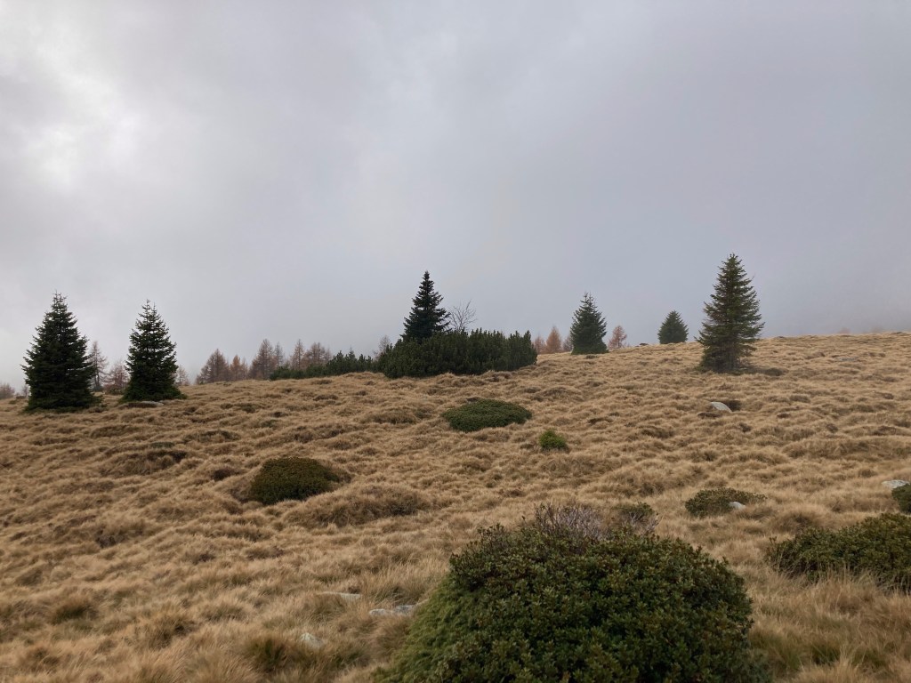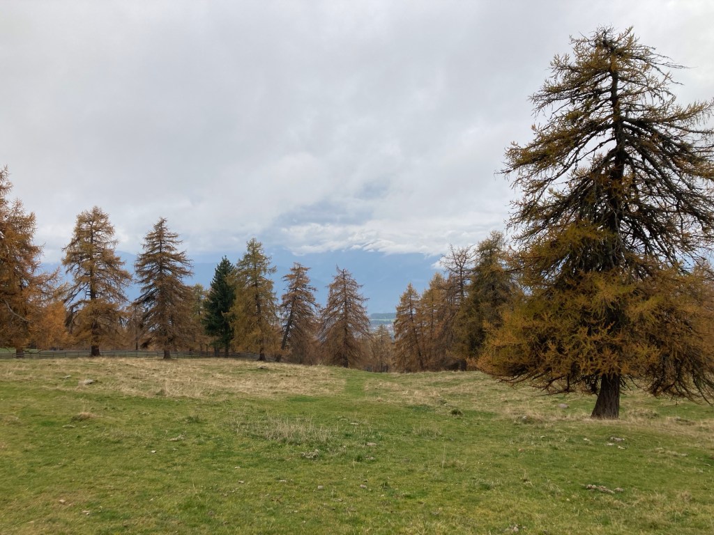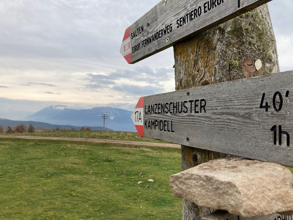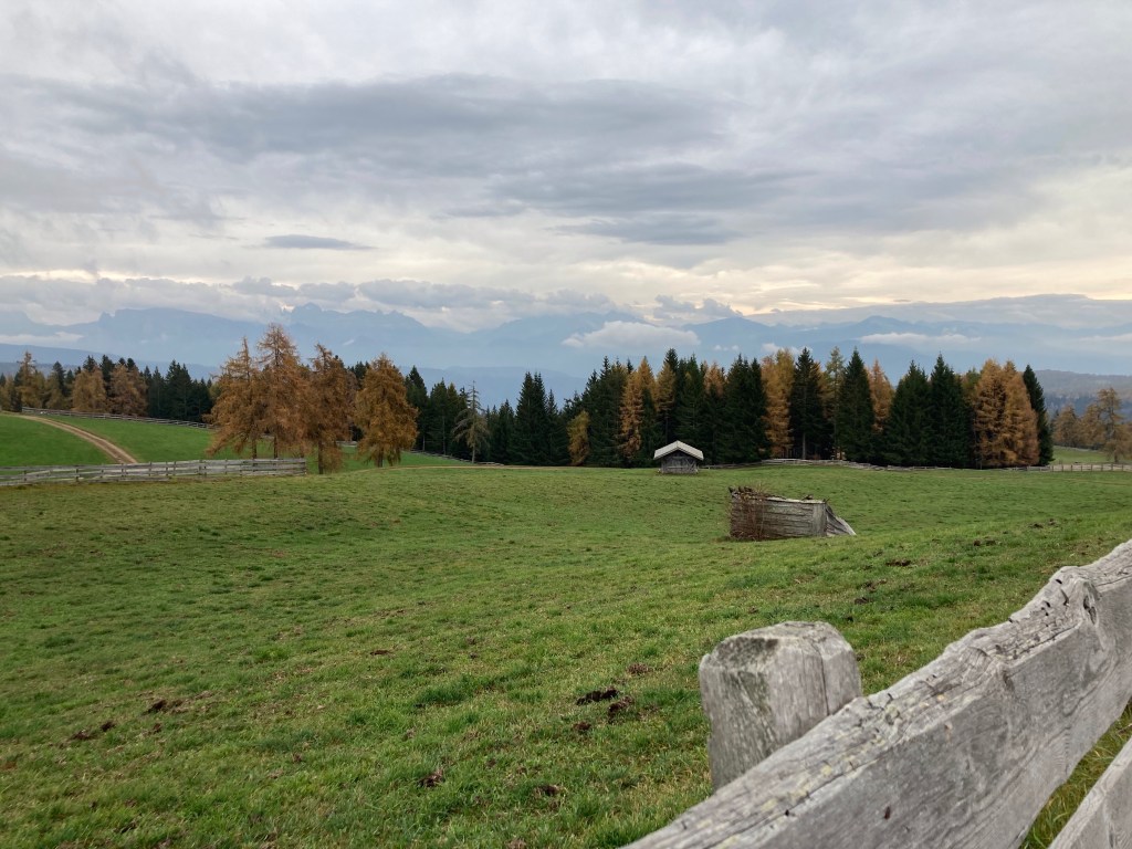 Beim Abstieg entlang des E5 beschränken wir uns beim Möltner Kaser auf ein Radler, denn nach dem letzten Abschnitt der Tour über den Rücken des Tschögglberges – mit einer Ahnung von Dolomiten als Hintergrundbild – vorfreut sich unser Hunger auf die leckerste Einkehr Südtirols, den Lanzenschuster. Dabei diskutieren wir, welche Stelle uns hier oben am allerbesten gefällt: die „wilden“ Flächen an der Baumgrenze zu den ersten Bergkiefern(?) weiter oben oder die mit Lärchen garnierten, umzäunten Weiden inklusive Haflingern und Grauvieh.