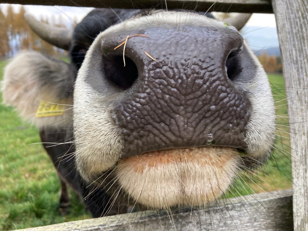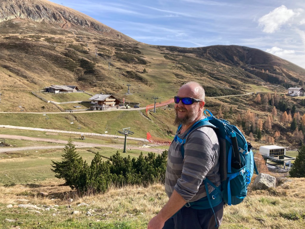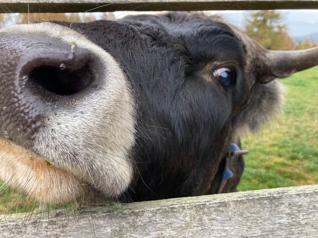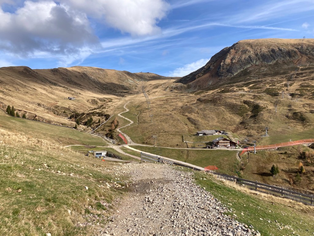 Beim Abstieg entlang des E5 beschränken wir uns beim Möltner Kaser auf ein Radler, denn nach dem letzten Abschnitt der Tour über den Rücken des Tschögglberges – mit einer Ahnung von Dolomiten als Hintergrundbild – vorfreut sich unser Hunger auf die leckerste Einkehr Südtirols, den Lanzenschuster. Dabei diskutieren wir, welche Stelle uns hier oben am allerbesten gefällt: die „wilden“ Flächen an der Baumgrenze zu den ersten Bergkiefern(?) weiter oben oder die mit Lärchen garnierten, umzäunten Weiden inklusive Haflingern und Grauvieh.