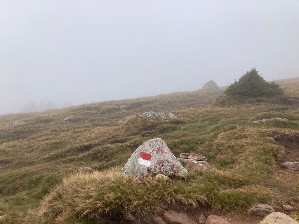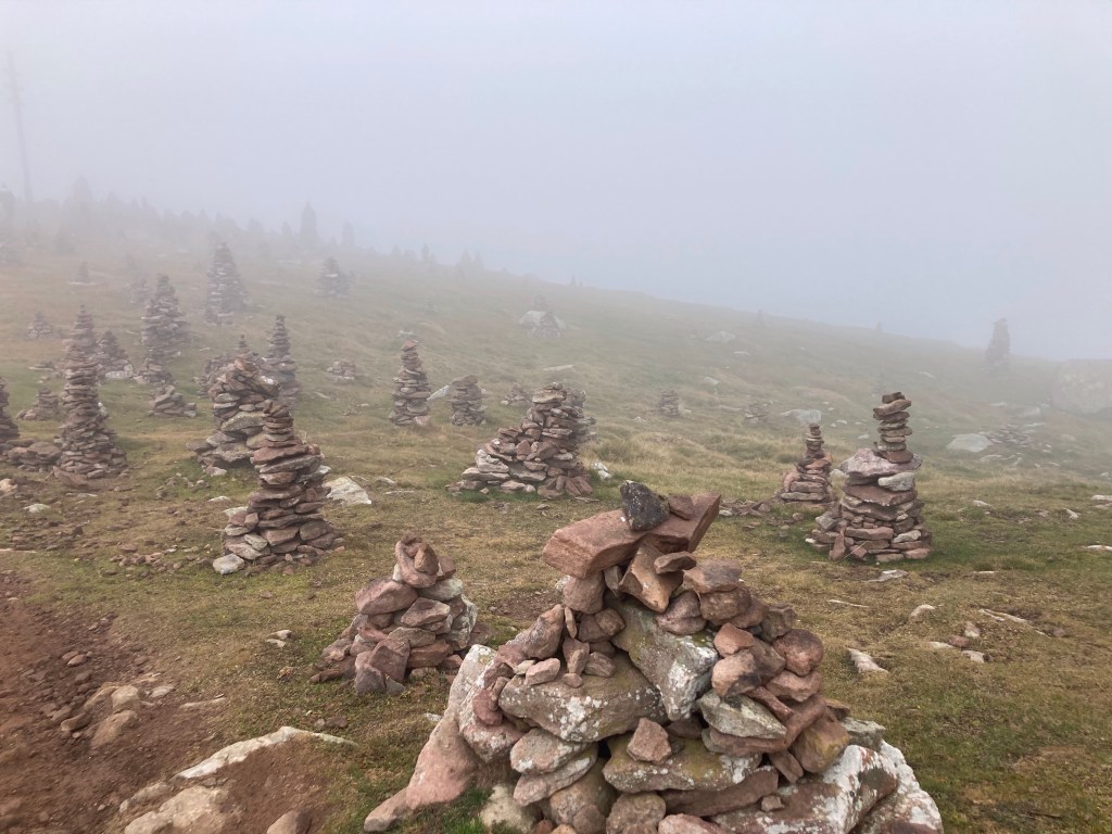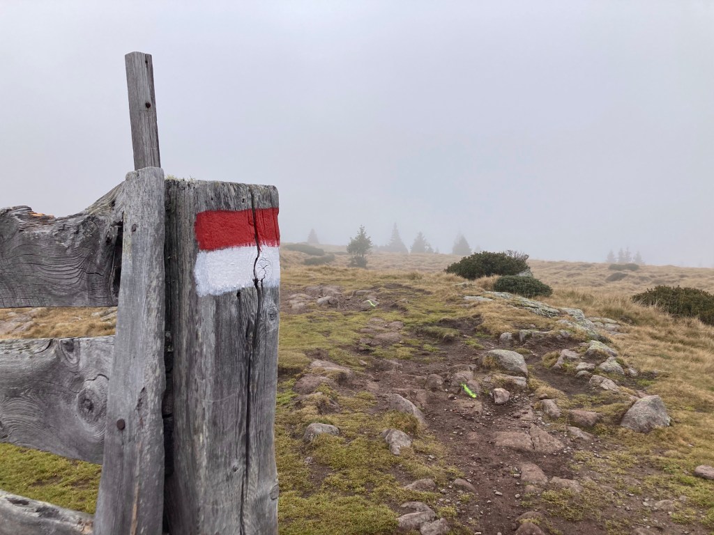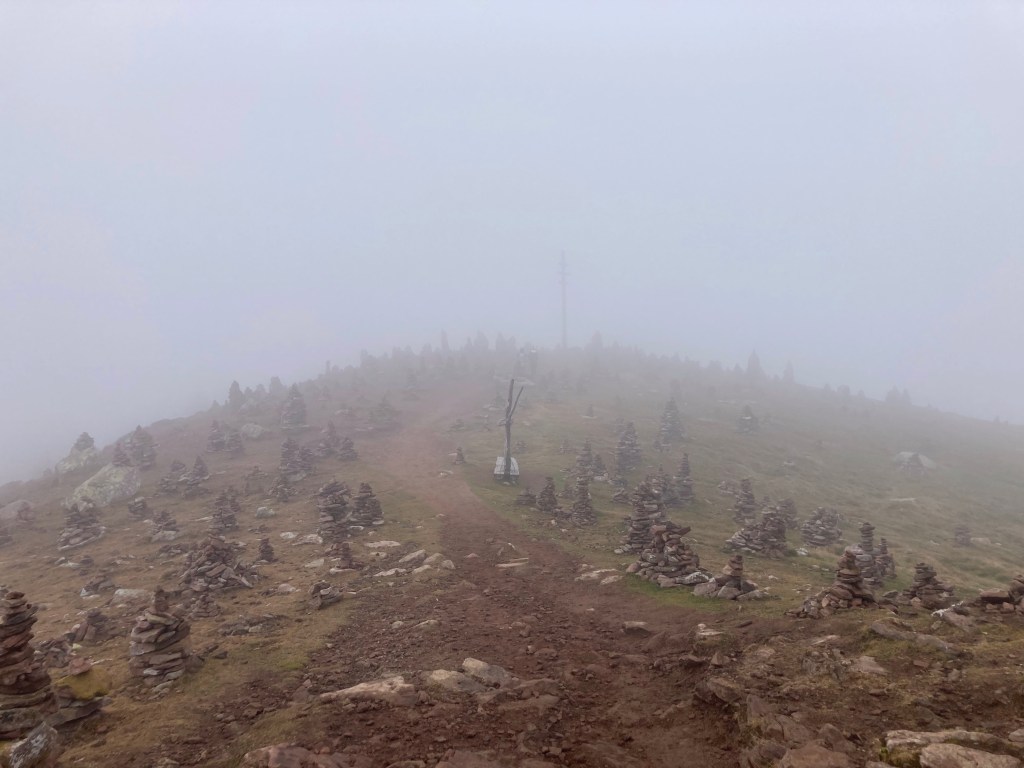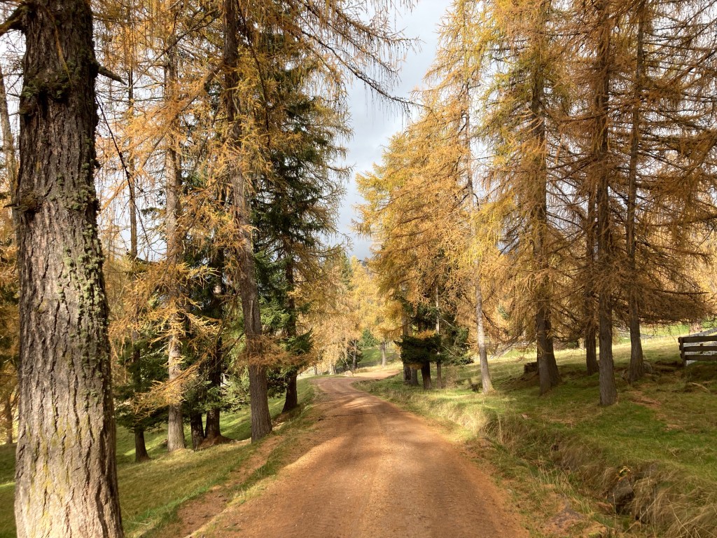 Der zweite Wandertag gehört dem Tschögglberg (Highlight Nr.1) oberhalb Vöran / Mölten / Hafling mit der Einkehr beim Lanzenschuster als krönendem Abschluss. Vom P-Platz Scheermoos (1400m) steigen wir über die Sattler Hütte zum Möltner Kaser auf und hängen die Runde über die Stoarnernen Mandln (2000m) dran: steil hoch, flach runter. Anfänglicher Niesel lockert sich auf und geht in tiefhängende Wolken über, die die Steinmännchen spooky-geheimnisvoll umwehen. Schließlich erkämpft sich die Sonne ein paar Lücken. Die gelbe Herbstfärbung rieselt von den Lärchen.