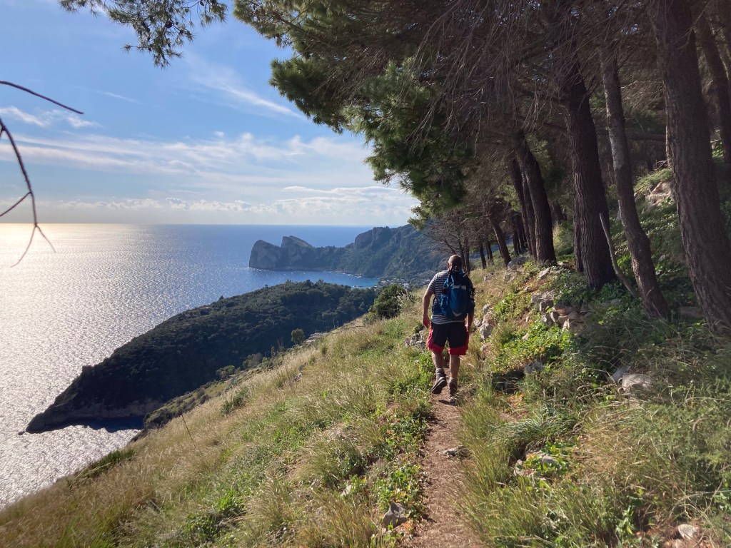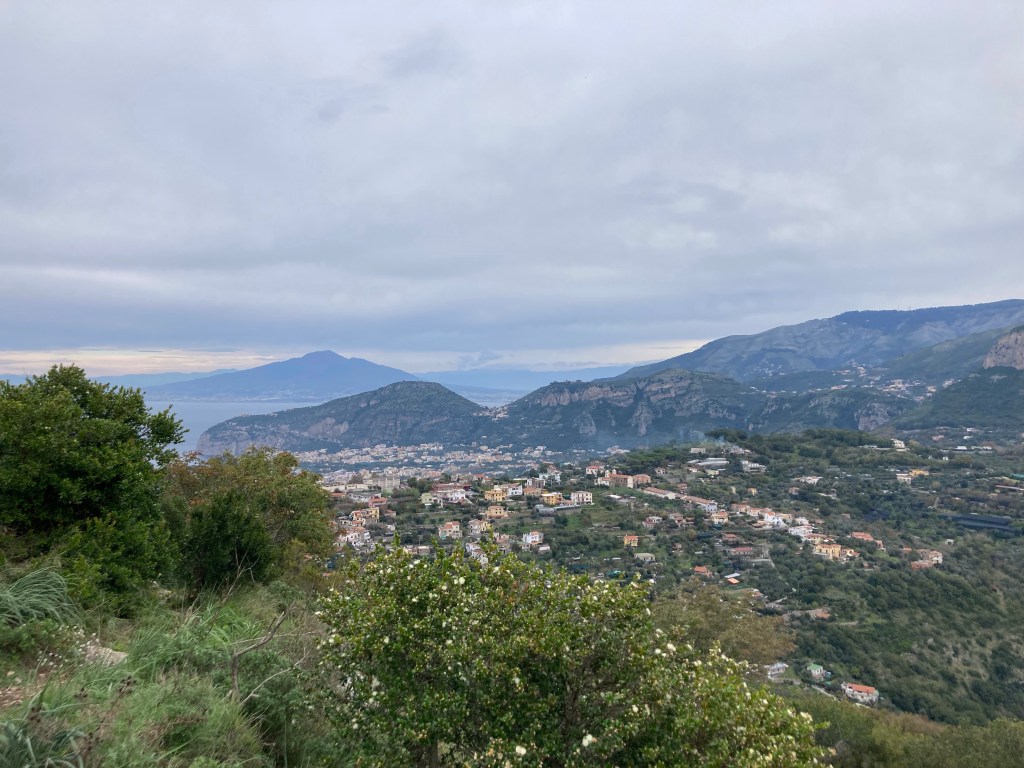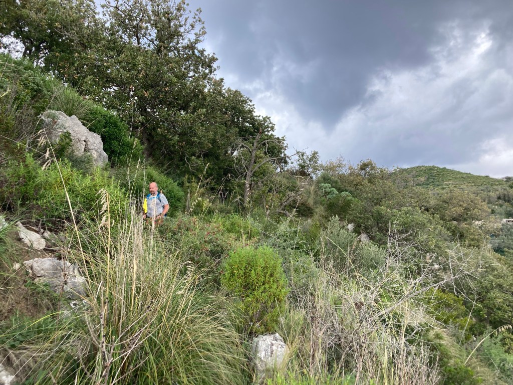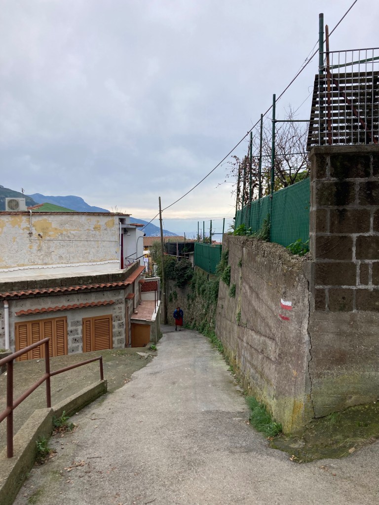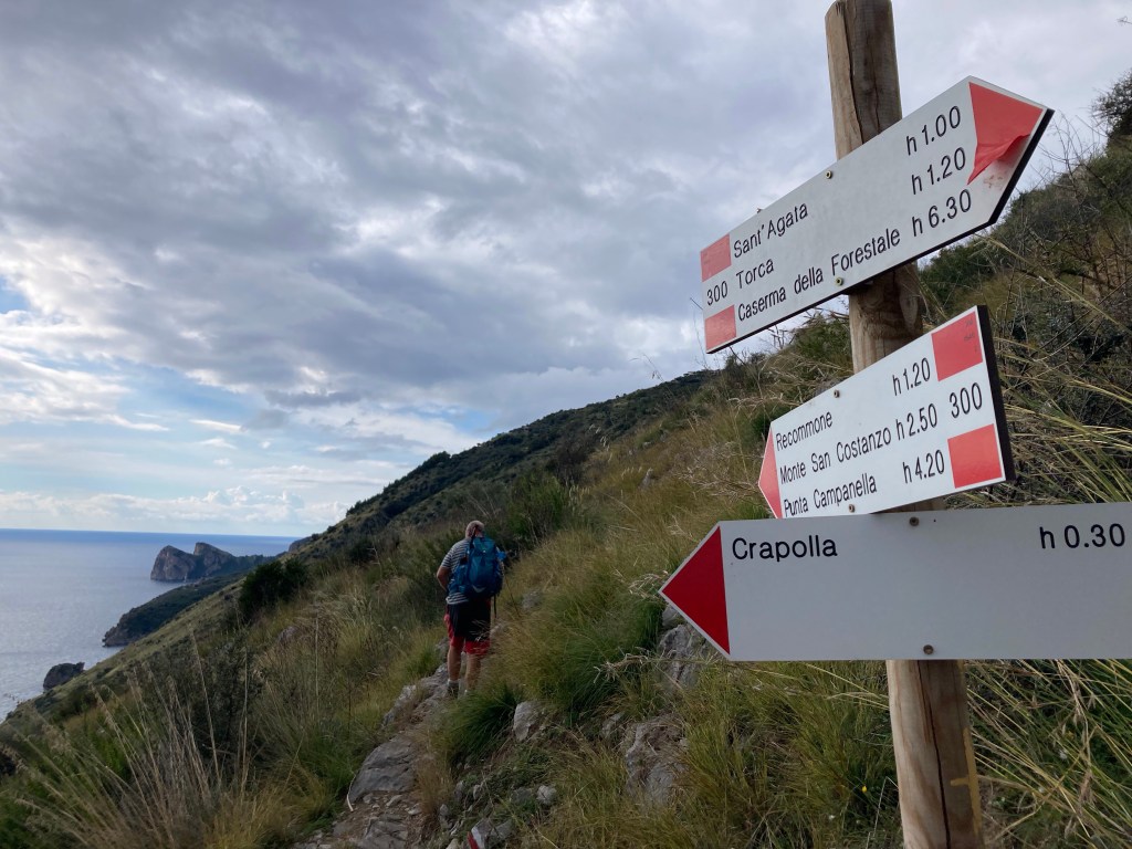 Die beiden folgenden Tage widmen wir deshalb einen Stückchen eines Sorrent-Abstechers des Sentiero Italia (SI), einem Fernwanderweg, der dem gesamten italienischen Alpenbogen, dem Apennin und schließlich den Höhenrücken Siziliens und Sardiniens folgt – meist in Höhen, die im November wenig einladend sind. Hier bezeichnet mit der CAI-Nummer 300 bewegen wir uns bei maximal 500 Hm sehr aussichtsreich über dem Meer (wir lieben Küstenwanderwege!). Vor unserer Schiebetür steigen wir auf zum Colli di S.Pietro, wandern auf Zivilisationswegen (Dorfgassen☺️ und Straßenränder😱) über den Colli Fontanelle, bis sich der Pfad als Singletrail am Südhang durch die Macchia windet: jetzt wird es traumhaft! Blick nach vorn (Capri), Blick zurück (Amalfi), quer ab ein paar Inselchen: das ist mediterranes Klischee-Wandern, so soll das! Später geht es über landwirtschaftliche Terrassen: Fenchel, Erbsen und Bohnen als Wintergemüse laufen gerade auf. Vom Dorf Torca steigen wir auf nach Sant´Agata, von wo uns ein Bus zurück zum Colli di S.Pietro bringt.