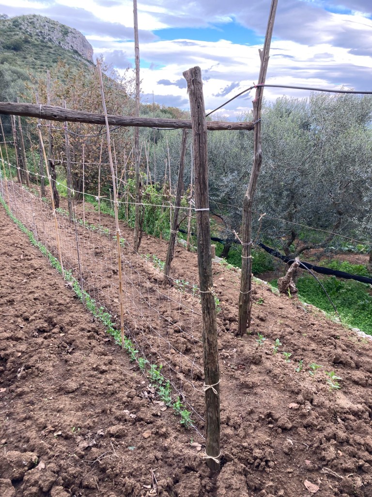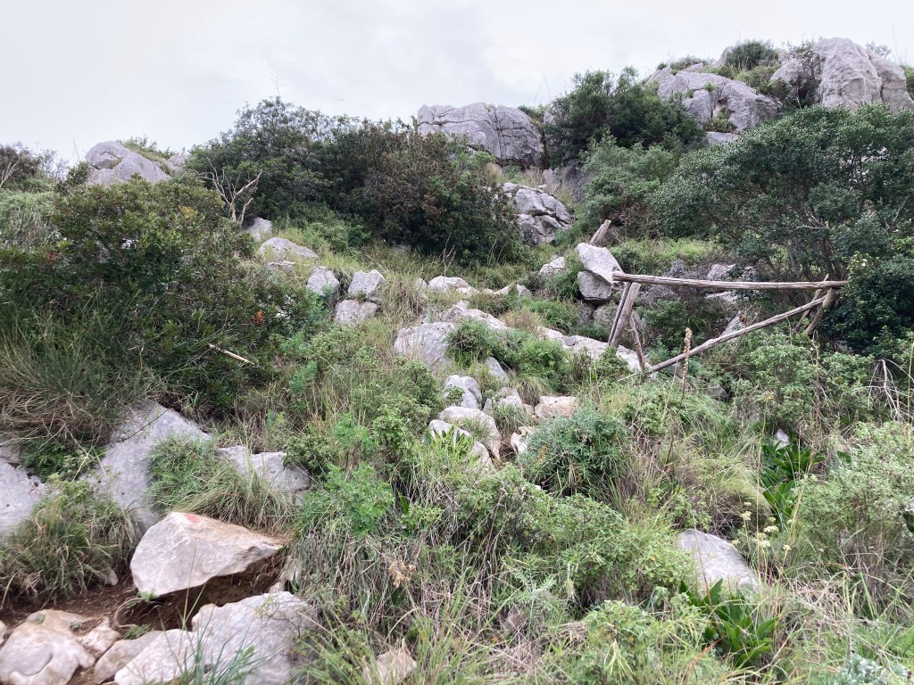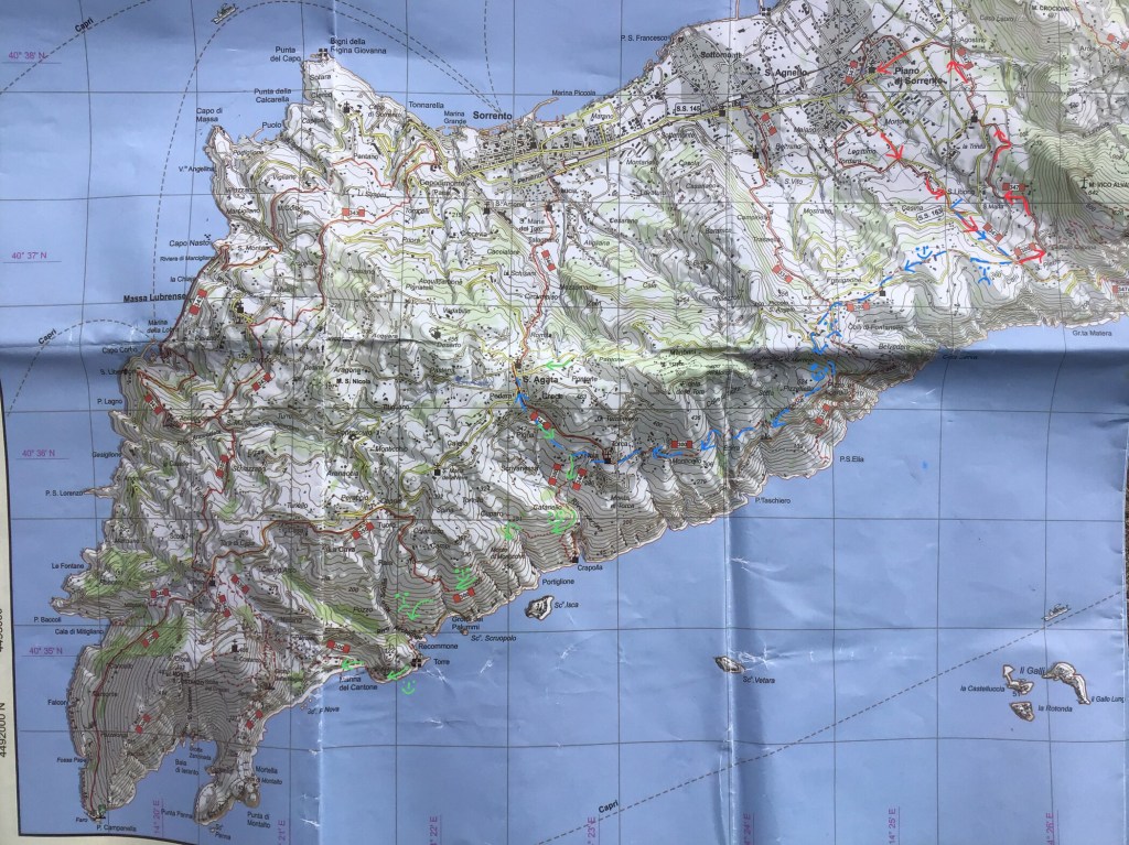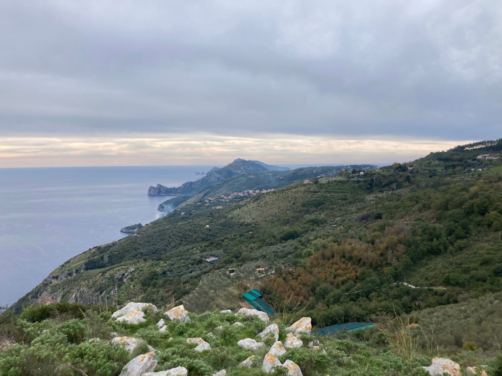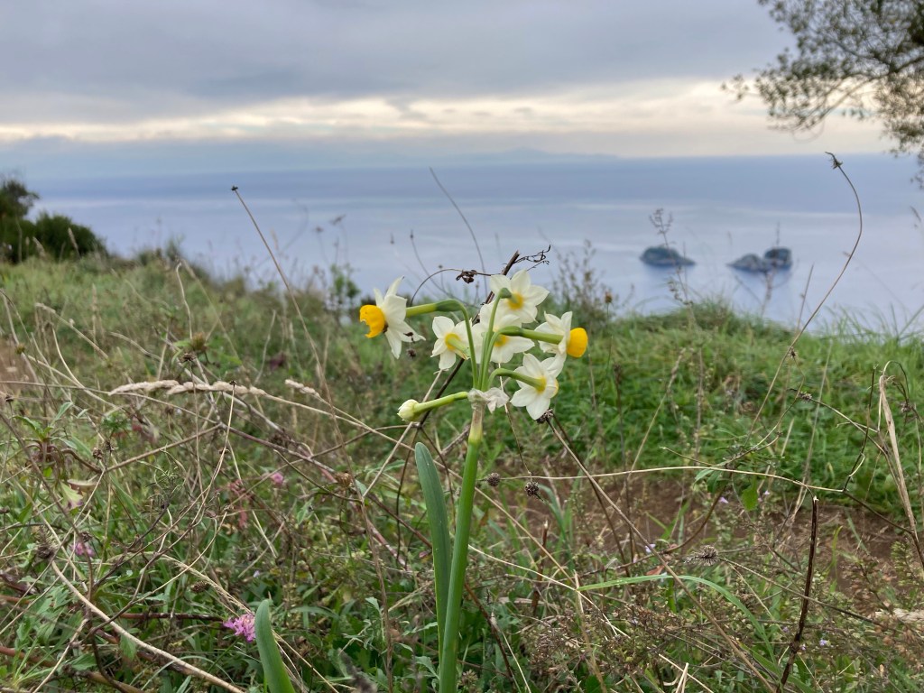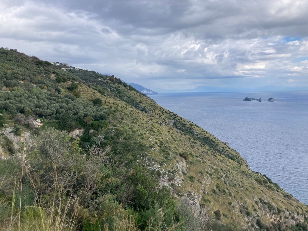 Die beiden folgenden Tage widmen wir deshalb einen Stückchen eines Sorrent-Abstechers des Sentiero Italia (SI), einem Fernwanderweg, der dem gesamten italienischen Alpenbogen, dem Apennin und schließlich den Höhenrücken Siziliens und Sardiniens folgt – meist in Höhen, die im November wenig einladend sind. Hier bezeichnet mit der CAI-Nummer 300 bewegen wir uns bei maximal 500 Hm sehr aussichtsreich über dem Meer (wir lieben Küstenwanderwege!). Vor unserer Schiebetür steigen wir auf zum Colli di S.Pietro, wandern auf Zivilisationswegen (Dorfgassen☺️ und Straßenränder😱) über den Colli Fontanelle, bis sich der Pfad als Singletrail am Südhang durch die Macchia windet: jetzt wird es traumhaft! Blick nach vorn (Capri), Blick zurück (Amalfi), quer ab ein paar Inselchen: das ist mediterranes Klischee-Wandern, so soll das! Später geht es über landwirtschaftliche Terrassen: Fenchel, Erbsen und Bohnen als Wintergemüse laufen gerade auf. Vom Dorf Torca steigen wir auf nach Sant´Agata, von wo uns ein Bus zurück zum Colli di S.Pietro bringt.