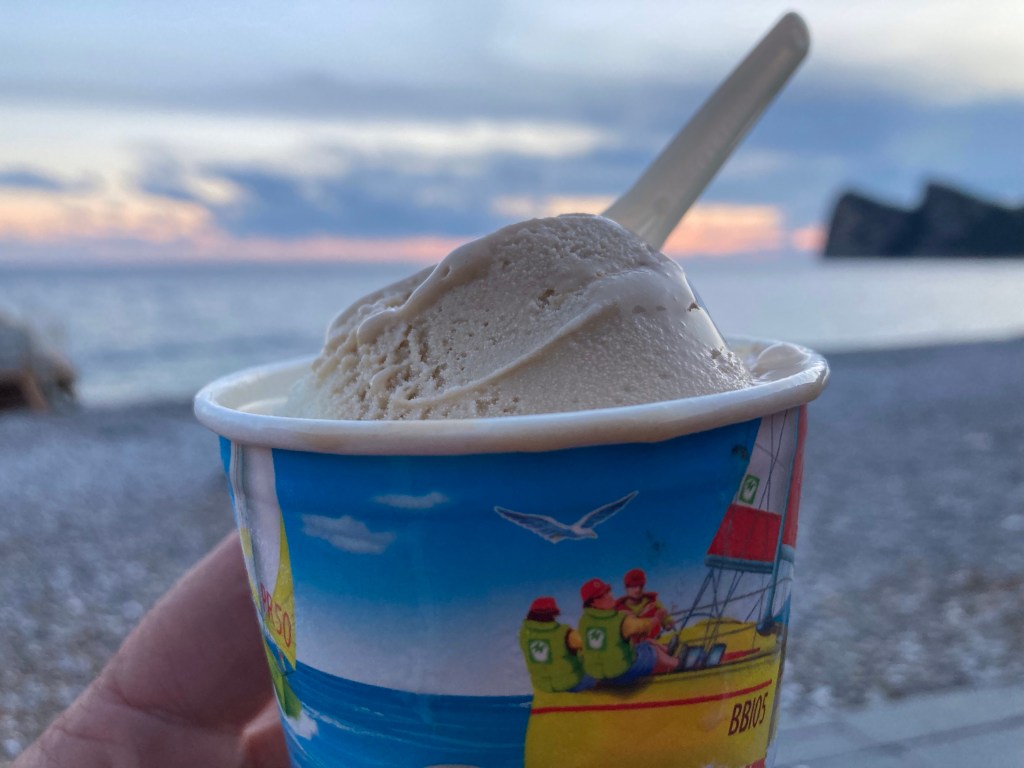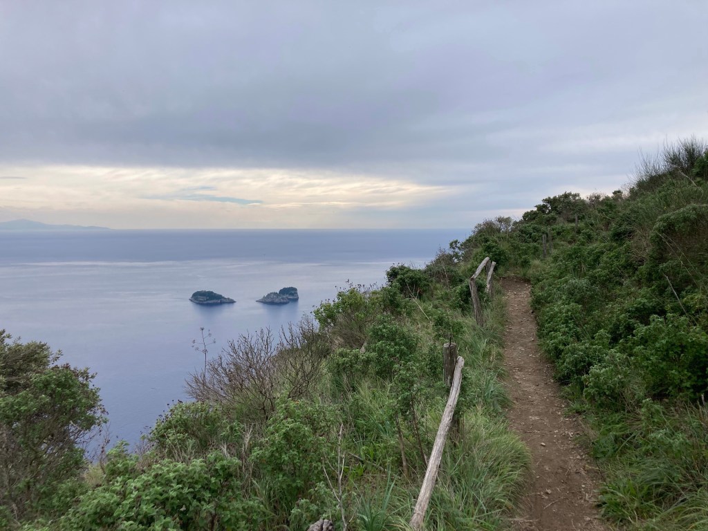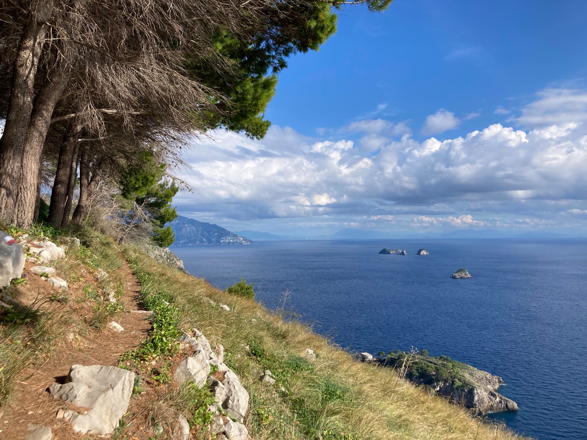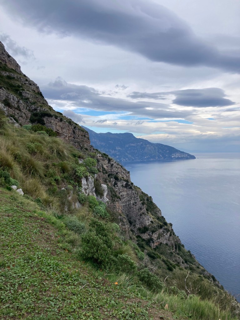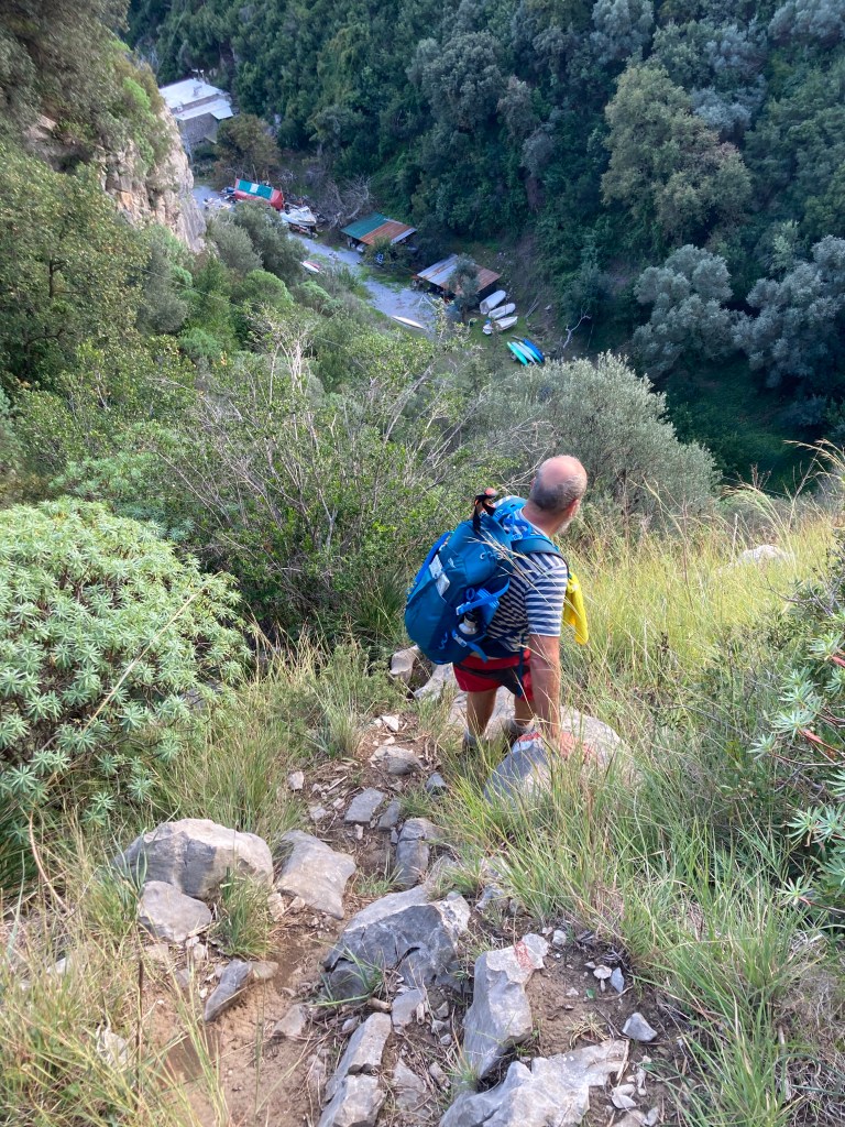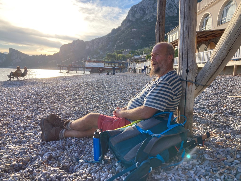 Den nächsten Tag starten wir in Sant´Agata und finden in Torca den SI wieder. Am Hang, ausgesetzt, alle Schauer ziehen an uns vorbei, Mittagspause mit Panoramico. Bis hier hin sehr schick! Beim Abstieg zeigt uns der Weg, was er mit dem Schwierigkeitsgrad EE meinte: das bisherige „zugewachsen ODER steil“ wird jetzt zum UND. Nicht schön. Schön wird es erst wieder in Meereshöhe – und endet sehr entschleunigt am Strand von Nerano, Marina del Cantone, den wir 15 Minuten nach der Busabfahrt erreichen. Wir überbrücken hier mit einem Eis und den länglichen Umstieg in Sant´ Agata mit einer Pizza. Wir haben ja Zeit und müssen nix.
