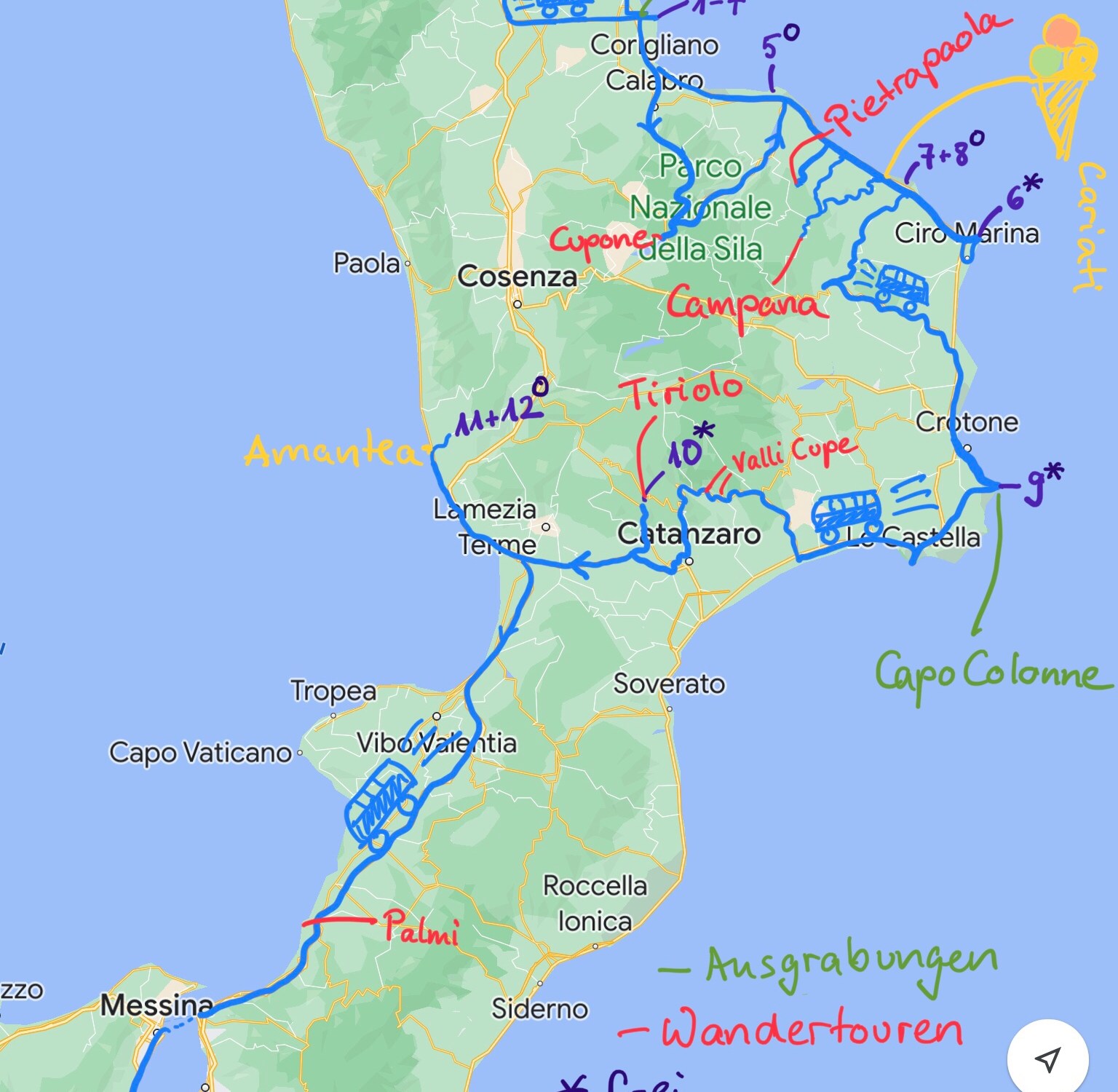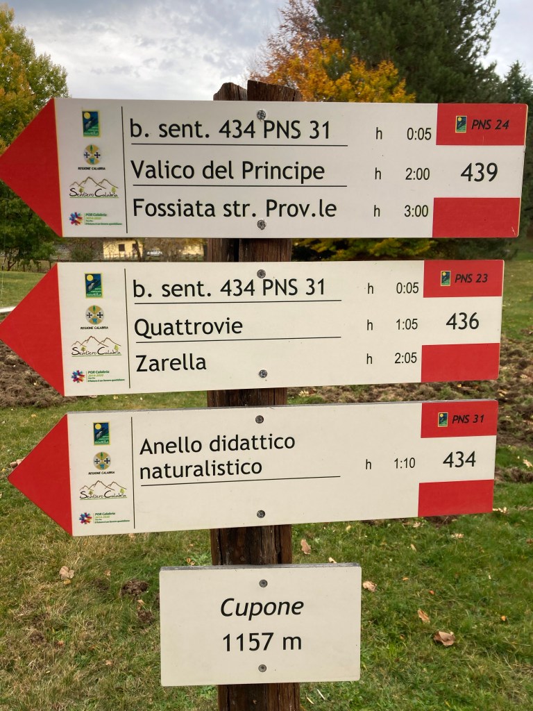 Typisch Italien soll sein, dass Wanderwege schlecht bis gar nicht markiert sind und nach einer Vegetationsperiode zugewachsen sind. Wir stellen fest, dass es hier oft zu viele (widersprüchliche) Markierungen gibt. Im Dorf stehen dann drei Infotafeln drei verschiedener Urheber (z.B. dem CAI, dem NP und eines lokalen Wandervereins) mit drei verschiedenen Nummerierungen: unklare Zuständigkeiten. In Kalabrien werden wir leider nicht von einer tollen CAI-Wanderkarte verwöhnt, aber die tschechische Wander-App mapy.cz hilft uns, aus den vorhandenen Informationen eine gute Route zu basteln und auf dem Rother zu improvisieren.