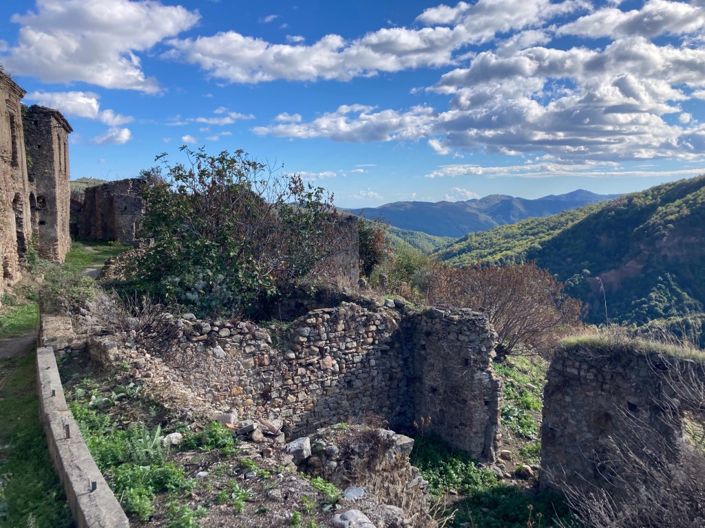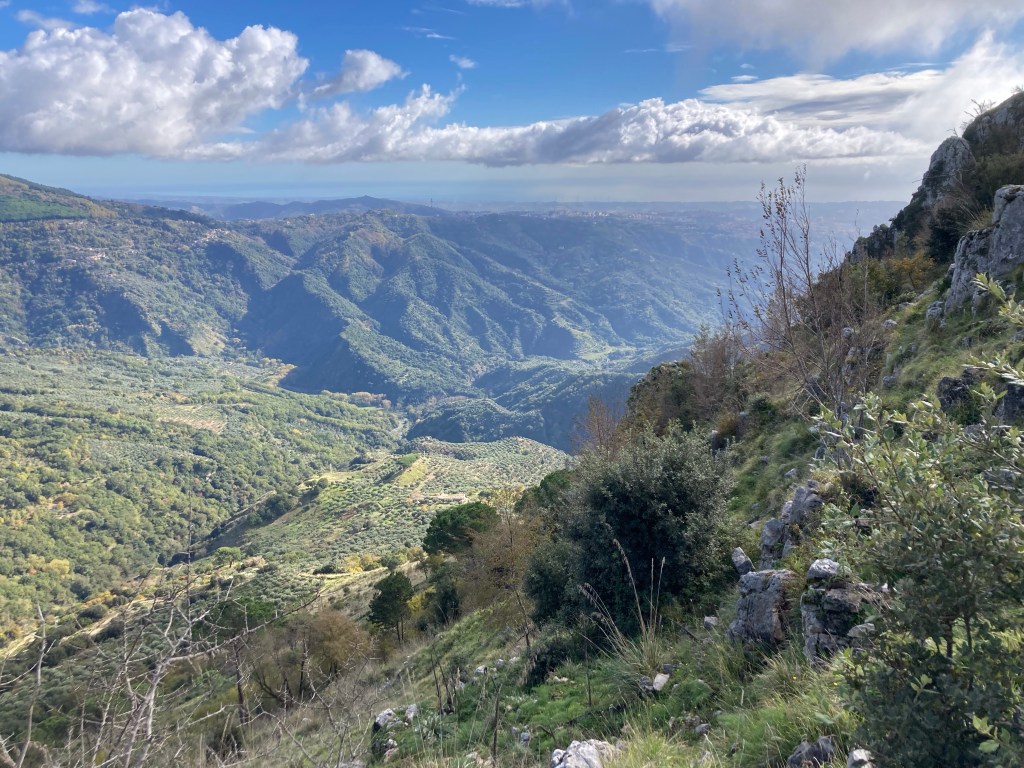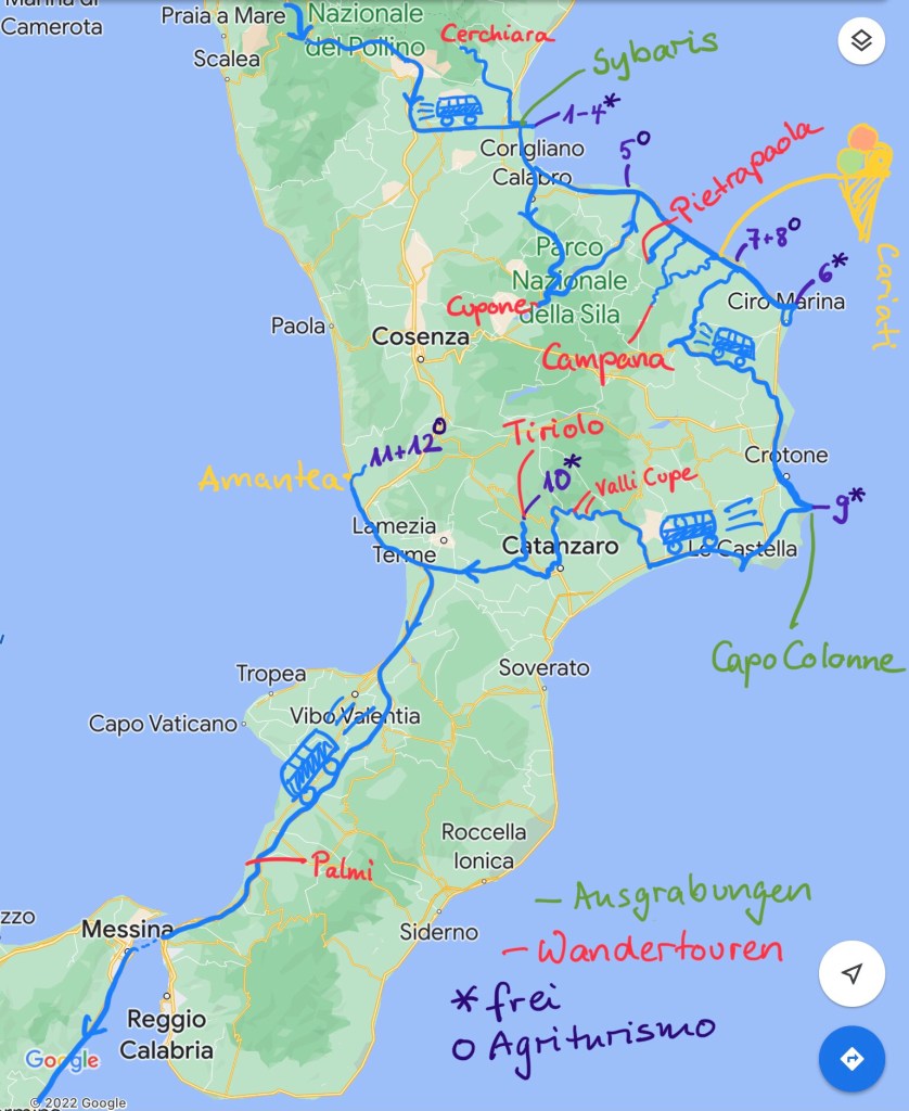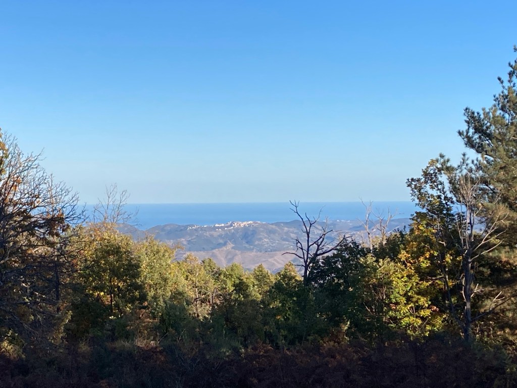 Wir wollen wandern – auch in Kalabrien. Der Rother Wanderführer verspricht uns tolle Wege in den Bergen Kalabriens: der Pollino NP, die Sila, Serre und Aspromonte. Aber auch in Süditalien gilt leider: pro 100 Höhenmeter büßt man 1 Grad der altweibersommerlichen Temperatur ein. Von den 20 Grad am Strand wären in 1500 Metern über dem Meer nicht viel übrig. Außerdem lieben wir Küstenwanderungen – oder zumindest den Blick aufs Meer. Am Meer jedoch liegen die “neuen” Teile der Ortschaften, verläuft die Küstenstraße, ist die Ebene nicht nur von Orangen- und Olivenbäumen geprägt, sondern auch von kalabresischer Zivilisation, und zwar vor allem ihren Schattenseiten. So ist das kalabresische November-Wandern nicht frei von Herausforderungen, auf halber Höhe zwischen Strand und Gipfeln werden wir aber fündig.