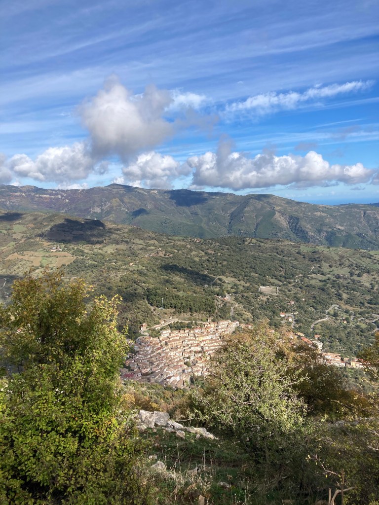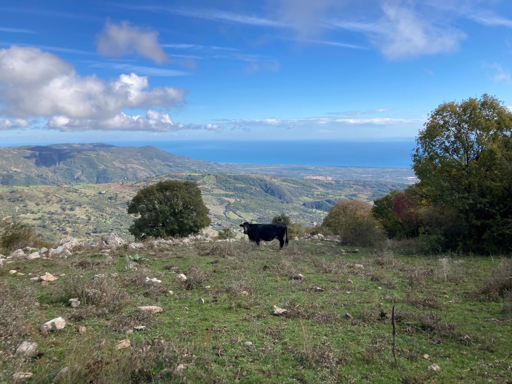 Cerchiara di Calabria liegt am SO-Hang des Pollino NP. Wir wandern aussichtsreich und sonnig am Hang entlang auf alten Pflasterwegen (CAI 946) zur Santuario Santa Maria delle Armi (schickes Gemäuer) und „verzichten“ auf die Überschreitung des Monte: keine Lust auf „Hochnebel“. Die Rückwegvariante ist dann auch fast gar nicht zugewuchert und neben den Kuhfladen auch kaum rutschig. Der Blick über die Sibaritide vermittelt uns ein gutes „Raumgefühl“ für die Gegend der nächsten Tage. Den Tag runden wir ab mit einem local-food-Einkauf im Dorfladen von Cerchiara: Dorfpasta, Dorfwein, Dorf-Sauerteigbrot.