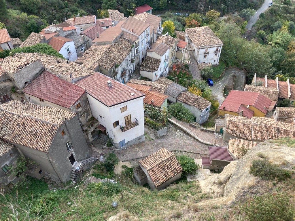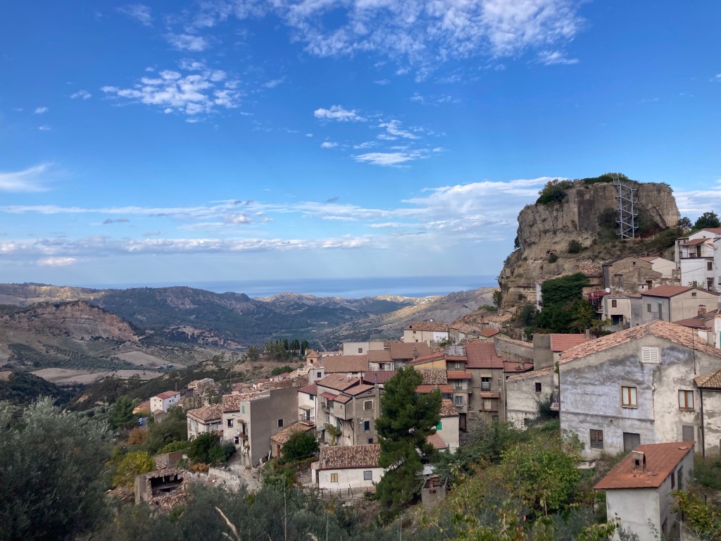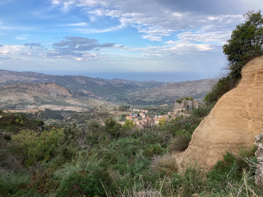 Pietrapaola liegt in der Sila Greca, der Nord- bis Ostflanke der Sila. Ein hübschen Dorf mit Hausberg in der Mitte. Wir sind spät dran und vereinfachen den Rother-Vorschlag: eine Runde über die Wind-und-Wasser-erosionsgeformten Hügel oberhalb. Das weiche Gestein eignet sich hervorragend für Höhlen, die als Viehunterstände dienen. Nachdem wir den Höhenzug über dem Dorf überwunden haben, können wir bis in die Höhen der Sila und des Pollino NP gucken. Das macht Lust auf mehr, aber…