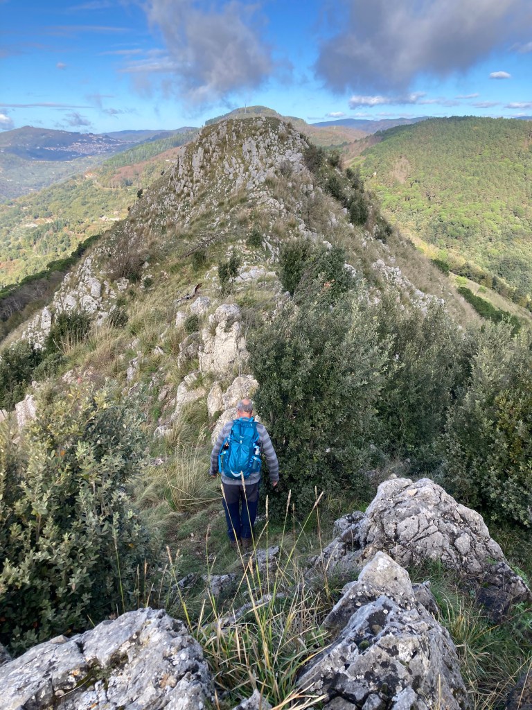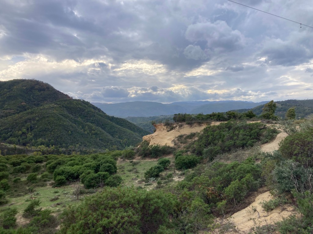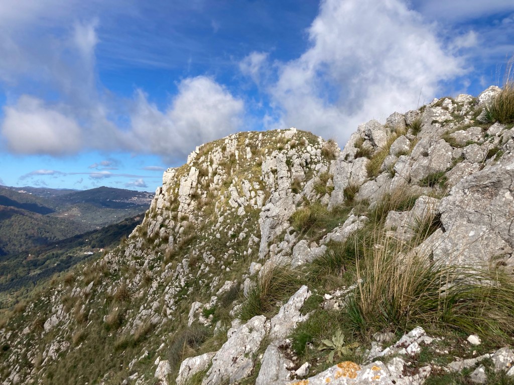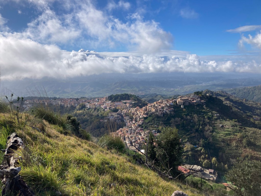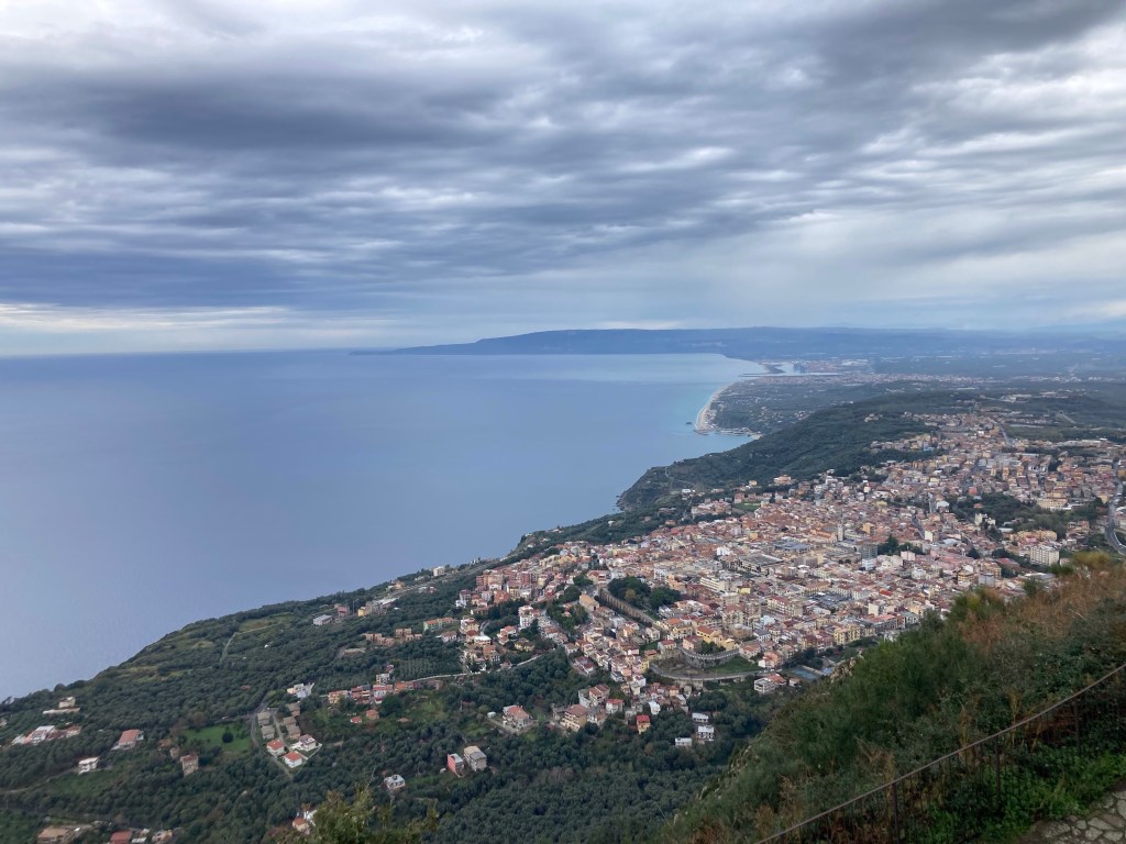 Tiriolo nennt sich das Dorf mit dem doppelten Meerblick. Auf dem südlichen Ende des Apennins (wenn man das Aspromonte nicht mitrechnet) und “auf” dem Isthmus von Kalabrien würdigen wir diese besondere Lage mit dem Aufstieg zum Monte Tiriolo und etwas Gratwanderung bis Gratkraxelei. Tatsache: das ionische und tyrrhenische Meer liegen zu unseren Füßen. Wäre das Schietwetter südlich von uns nicht, könnte man angeblich bis zum Ätna gucken. Den sehen wir erst viel später…
