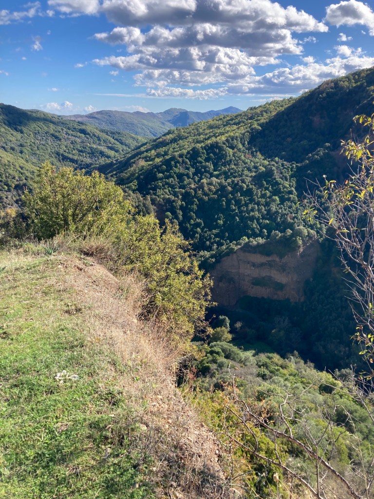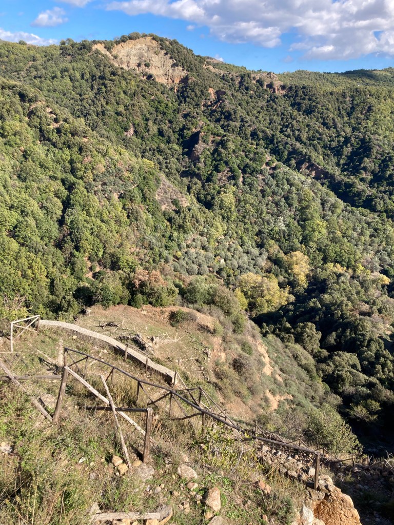Ab Campara an der Ostseite der Sila versuchen wir einer Talwanderung aus dem Rother zu folgen. Ab der halbverlassenen Altstadt wandern wir sonnig(en Mutes) los und werden aufgehalten vom abgerutschten Treppenweg ins Tal. Die Erosion, die hier die Landschaft formt, verschafft uns also eine vorgezogene Mittagspause. Sonne, Aussicht, local food: so darf das auch sein.