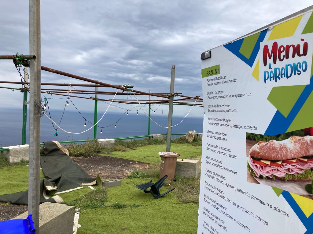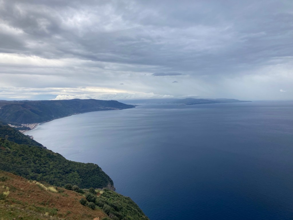 Als wir schon auf dem Weg nach Sizilien sind, macht das Schietwetter eine Pause und lässt uns an der Küste über Palmi mit Blick auf die Straße von Messina (der Ätna wolkenverhangen) und Stromboli wandeln. Wir lieben Küstenwanderungen – wenn man vor dem Regen wieder im Bulli sitzt: geschafft!