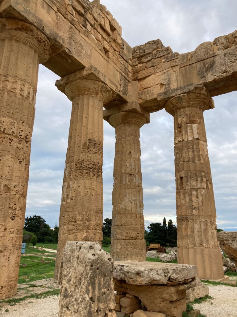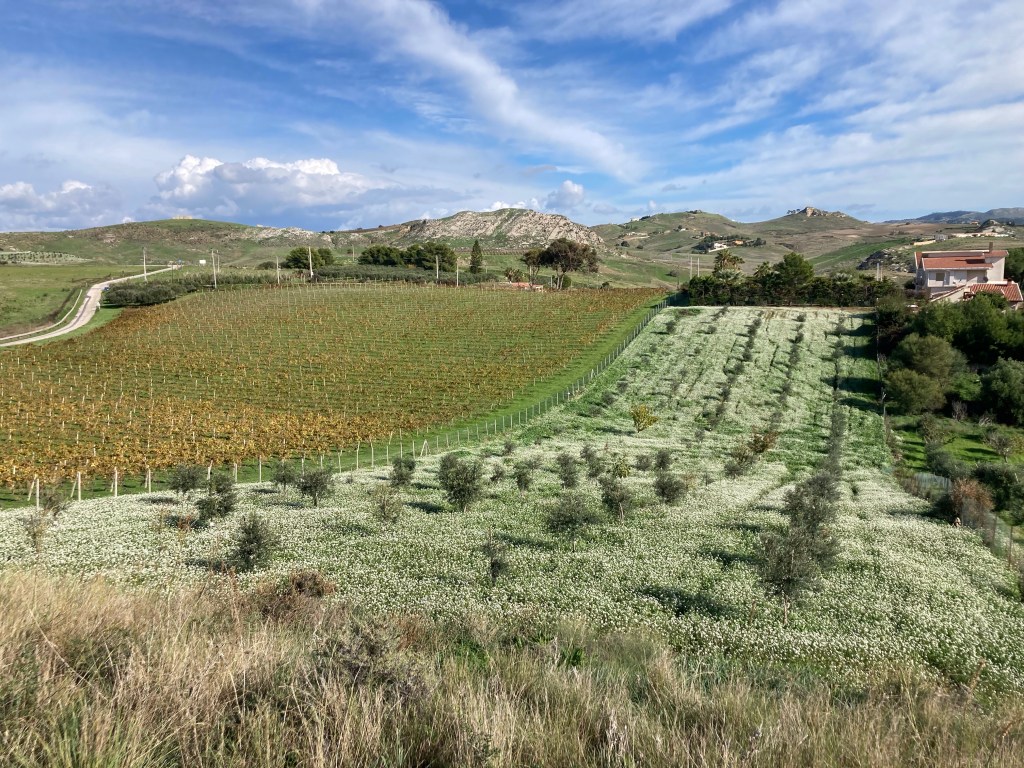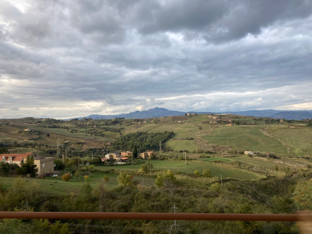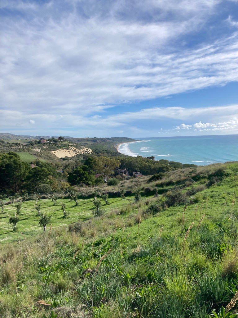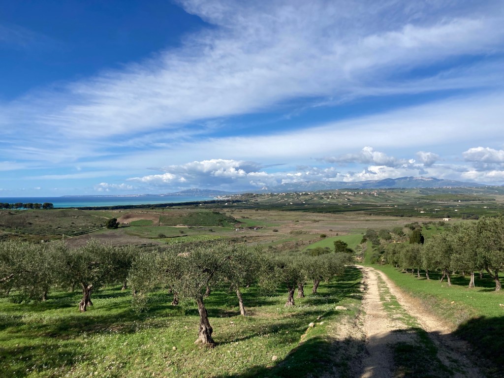 An der Südküste Siziliens finden wir Strand und Archäologie. Wir lassen Siracusa / Syrakus aus, wollen wir doch die Regenfront möglichst fix tunneln, und fahren durch das erstaunlich lieblich-hügelich-grüne Hinterland. Darauf waren wir nicht vorbereitet, denn außer der Stadt Enna legt uns unser Reiseführer (Michael-Müller-Verlag kaufen wir nicht wieder!) hier nichts ans Herz, es gibt weit und breit keine Camping-/Stellplätze oder Agricampeggio oder markierte Wandergebiete – sonst hätten wir hier innegehalten. Hier ist Tourismus nicht vorgesehen, aber uns gefällt diese unaufgeregte Toskana-ähnliche Landschaft.
