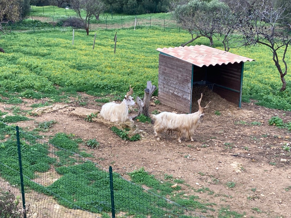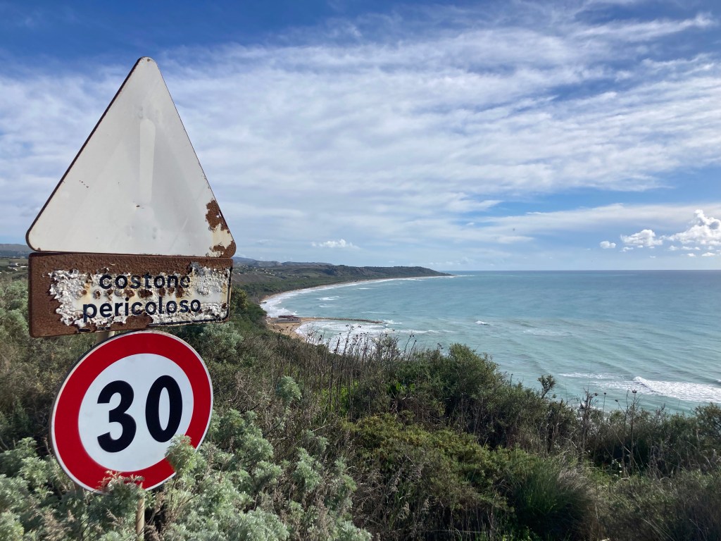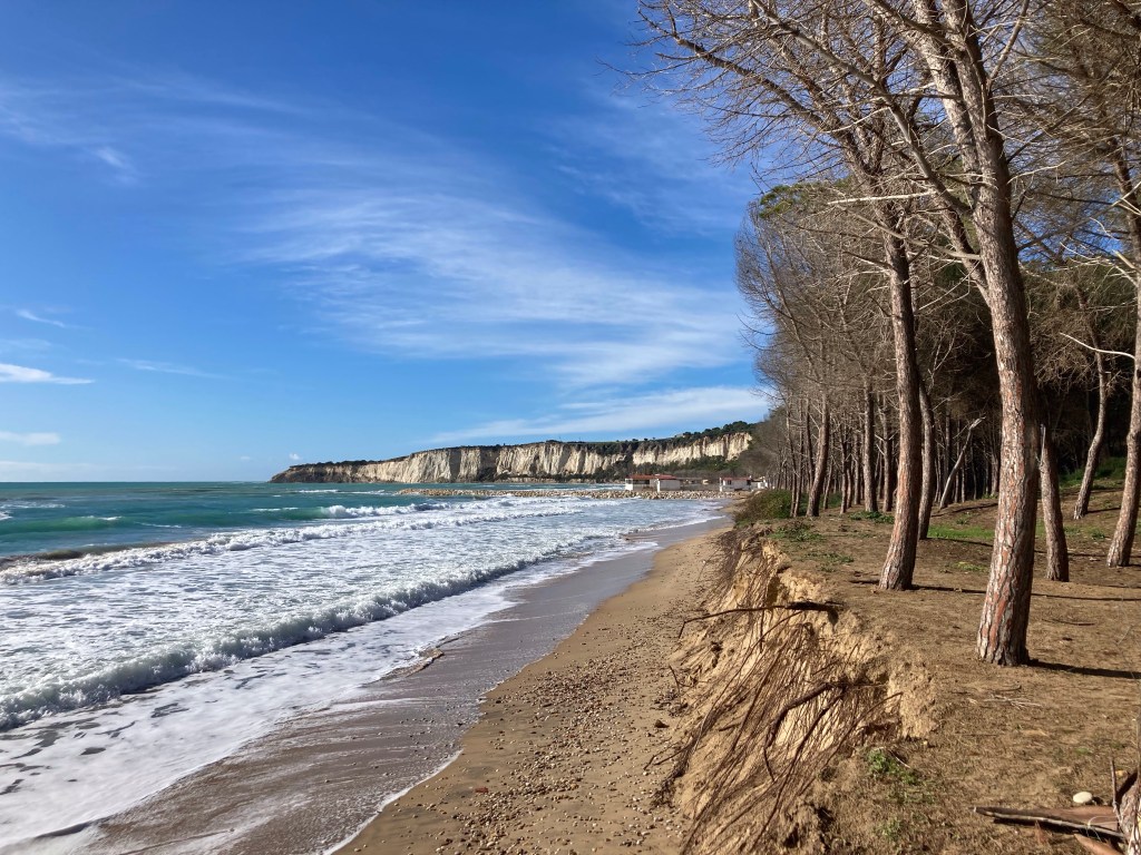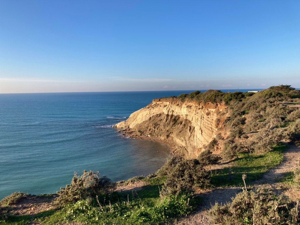 Ericlea Minoa hat Strand, Steilküste und einen kleinen Archäologie-Park in bester Lage. Vom Parkplatz des Parks (erhalten ist wohl ein kleines teatro, das den Autos auf dem Parkplatz nach zu urteilen viele Menschen beschäftigt) gehen wir zwei Runden: erst nach SW über eine Landzunge / Capo (drumherum wäre mit ein paar Schwimmzügen möglich) mit Schafen und Panoramico. Dann nach SO durch den trostlos verlassenen Badeort an den Strand, durch den Pinienküstenwald, an Lost-Place-Strandbars vorbei und über der Küste (Ferienhäuser, Oliven, Schafe) zurück. Abschließend Sonneruntergang am Capo. Bewacht von 2 Security-Menschen und taghell ausgeleuchtet übernachten wir hier besonders sicher – und mit Meerblick.