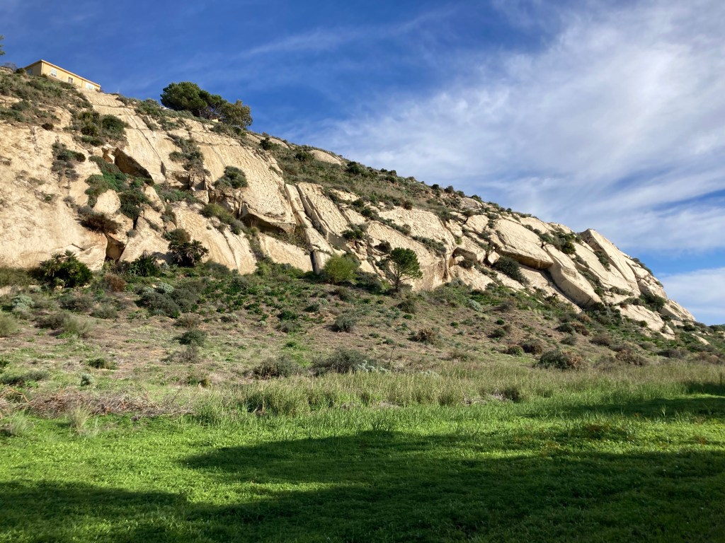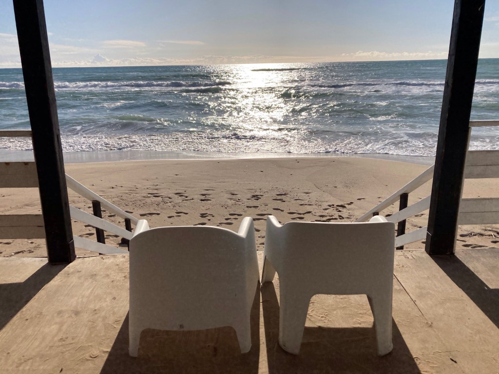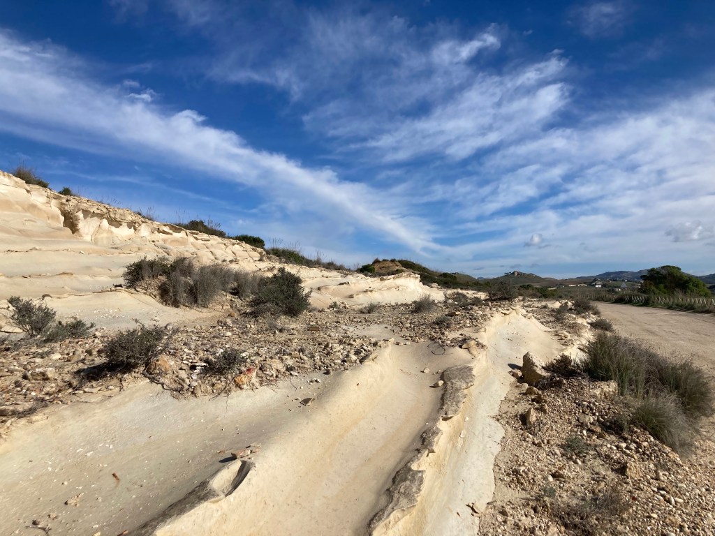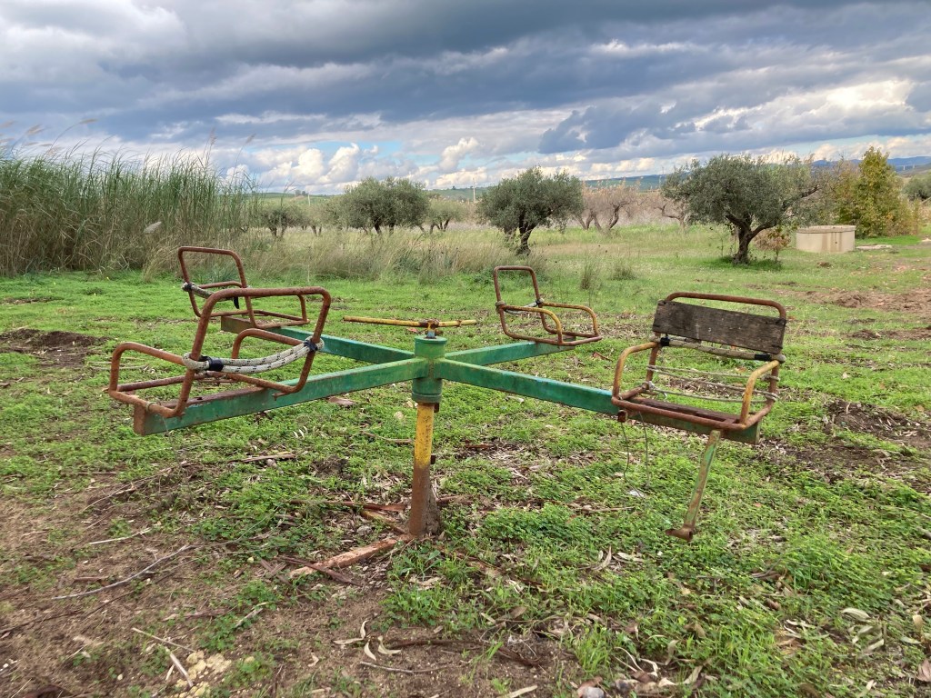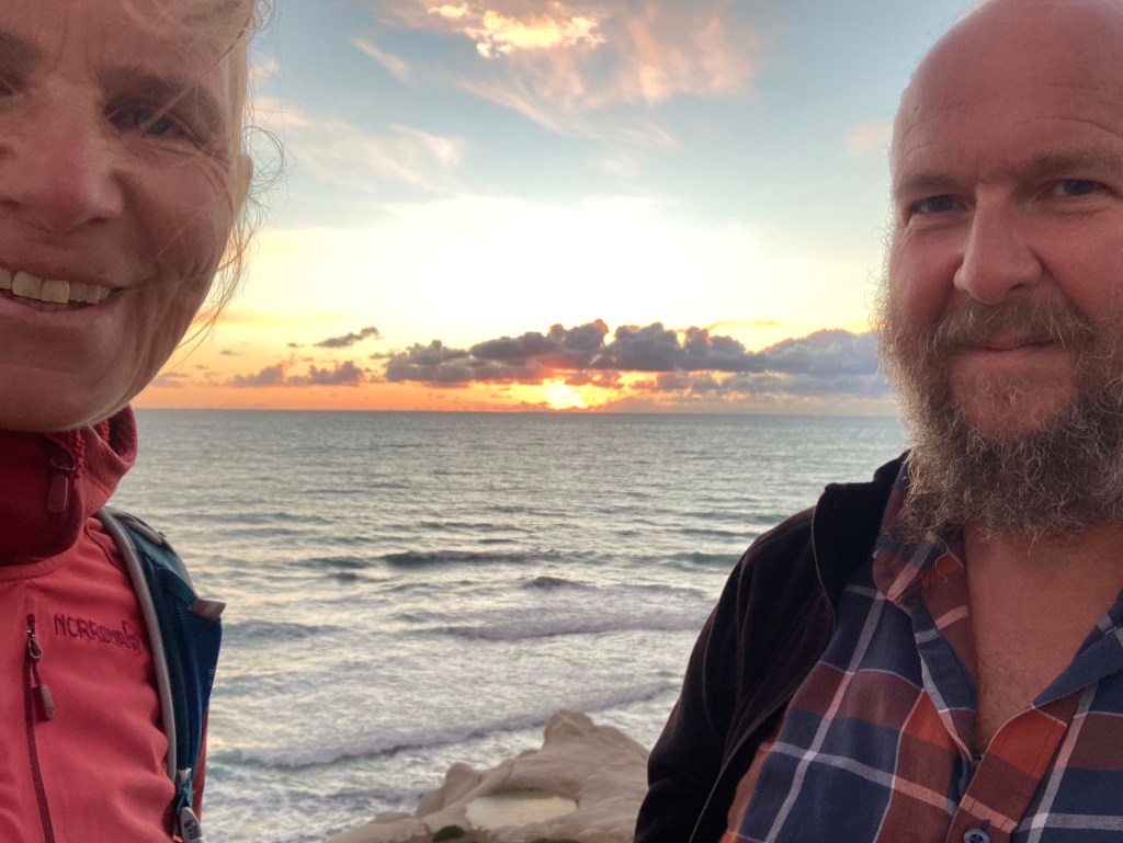 Ericlea Minoa hat Strand, Steilküste und einen kleinen Archäologie-Park in bester Lage. Vom Parkplatz des Parks (erhalten ist wohl ein kleines teatro, das den Autos auf dem Parkplatz nach zu urteilen viele Menschen beschäftigt) gehen wir zwei Runden: erst nach SW über eine Landzunge / Capo (drumherum wäre mit ein paar Schwimmzügen möglich) mit Schafen und Panoramico. Dann nach SO durch den trostlos verlassenen Badeort an den Strand, durch den Pinienküstenwald, an Lost-Place-Strandbars vorbei und über der Küste (Ferienhäuser, Oliven, Schafe) zurück. Abschließend Sonneruntergang am Capo. Bewacht von 2 Security-Menschen und taghell ausgeleuchtet übernachten wir hier besonders sicher – und mit Meerblick.