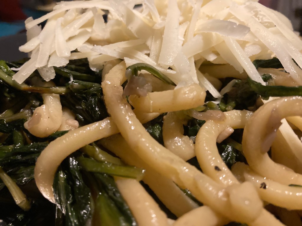 Am besten kocht man die kleingeschnittene Cicorie 5-10 min in leicht gesalzenem Wasser. In einer Pfanne erhitzt man dann etwas Olivenöl und schwitzt eine kleingewürfelte Zwiebel und 2-3 feingeschnittene Knoblauchzehen an. Dann kommt die abgetropfte und evt. ausgedrückte Cicorie dazu und alles wir kurz sautiert. Wenn man die Flamme heruntergedreht hat, kommen die Pasta und ein guter Schluck Olivenöl dazu. In unserer Busküche mit nur zwei Flammen, habe ich die Cicorie nicht vorher gekocht, sondern gleich kleingeschnitten auf die angeschwitzten Zwiebeln gegeben und in der Pfanne weich gekocht – geht auch. Mit ordentlich geriebenem Parmesan ein Gedicht!