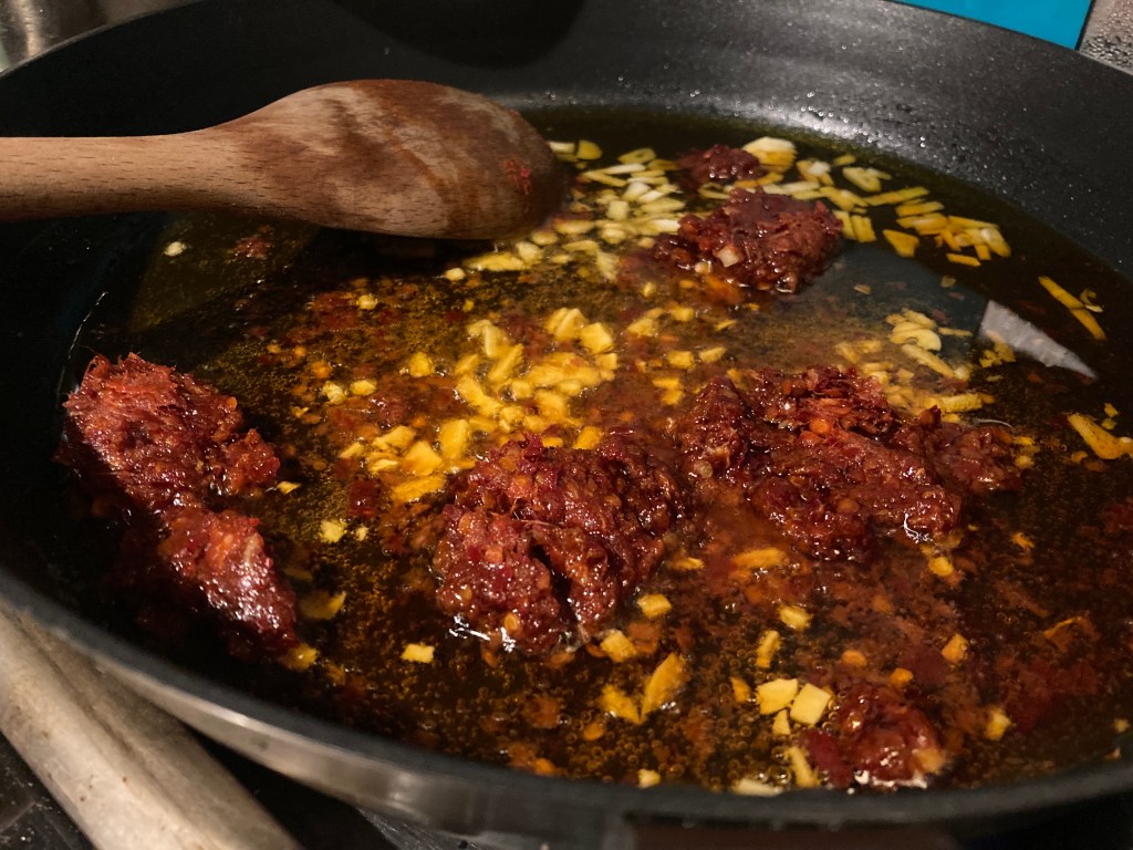 Kalabrische Variante: Zu den Zwiebeln und dem Knoblauch einige Stücke `Nduja (oder etwas Chilipaste/-flocken) geben und mit anschwitzen, so kommt mehr Wumms in das Essen.
