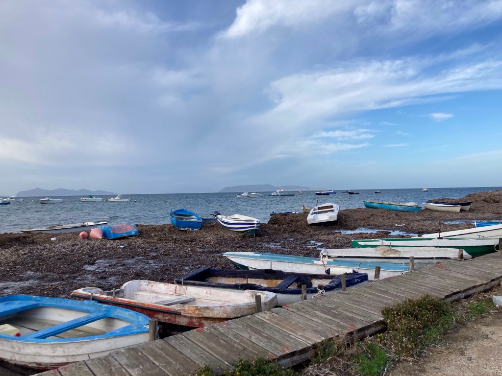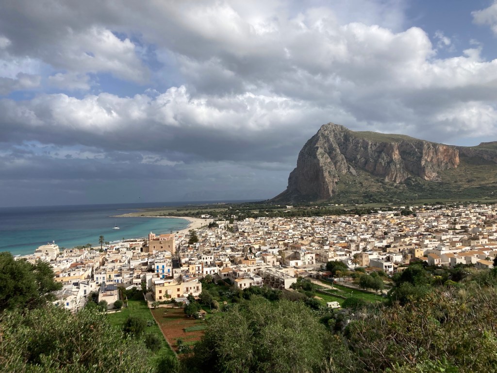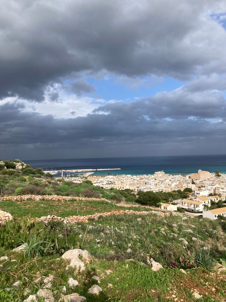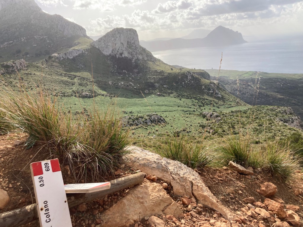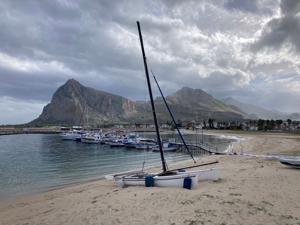 Von San Vito lo Capo unternehmen wir zwei Wanderungen. Die erste wird überschattet (im wahrsten Sinne) von der Ankündigung von Schauern und Gewitter – sowohl von yr.no als auch dem analogen Blick in die Runde. Wir wagen uns erstmal „nur“ durch den Ort, dann um den Leuchtturm, werden mutiger, setzen fort über Salzwiesen und die Ebene oberhalb des Ortes. Weil die dunklen Wolken überall, nur nicht über uns sind, wagen wir uns nach einem Zwischenstopp zu Arrancini und Chinotto noch ein Stück in die andere Richtung und bewundern den Monte Monaco von unten, der mit seiner „Langen Anna“ die Bucht überragt. Wir bleiben trocken – auch weil wir wegen des Windes doch nicht baden.