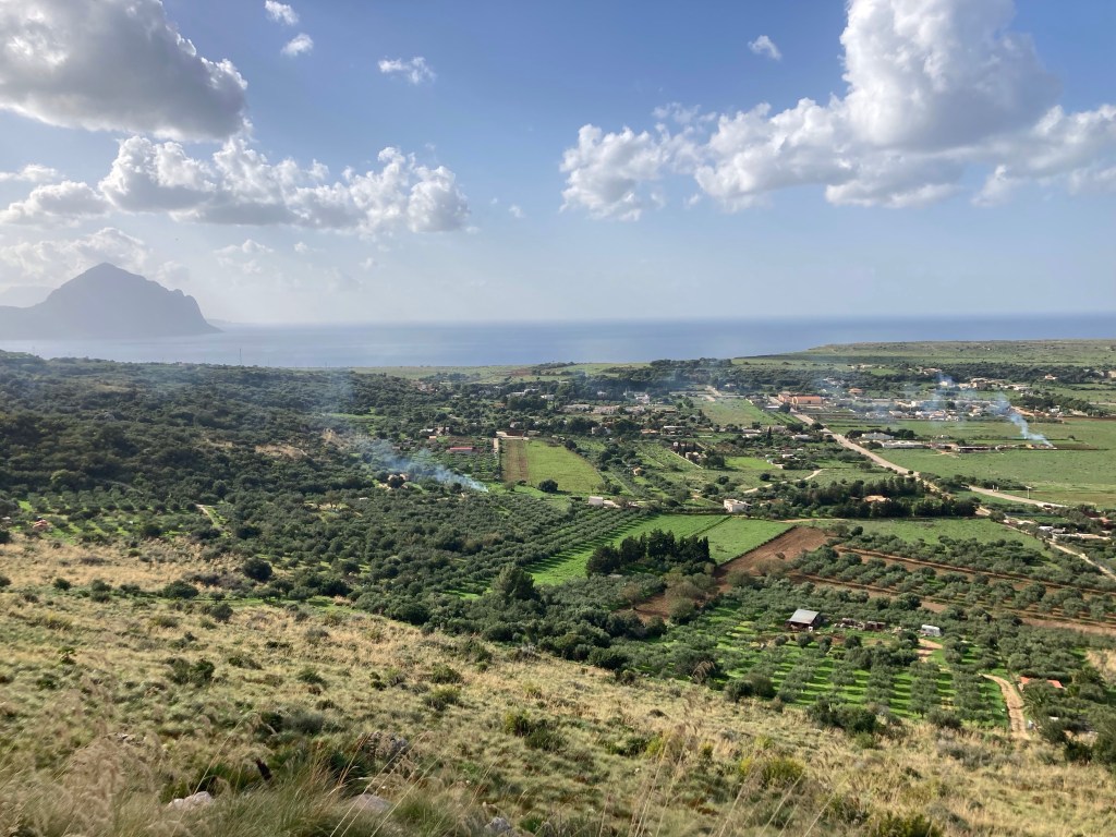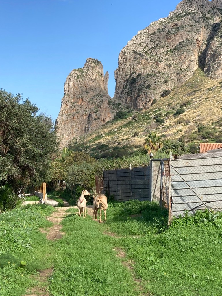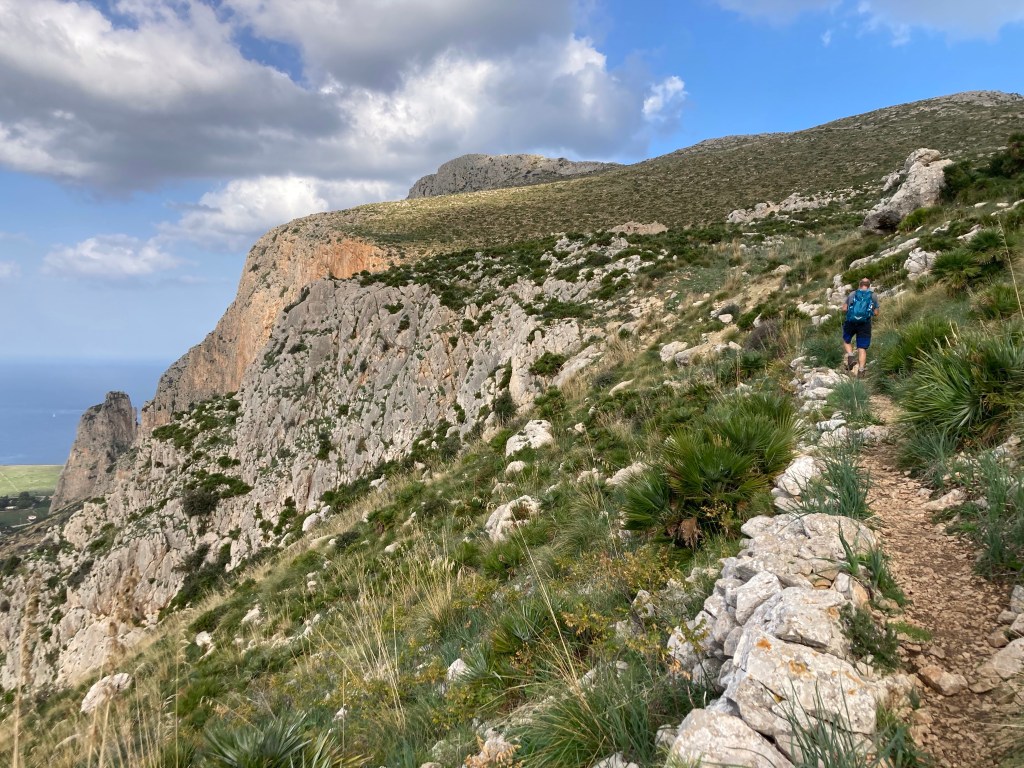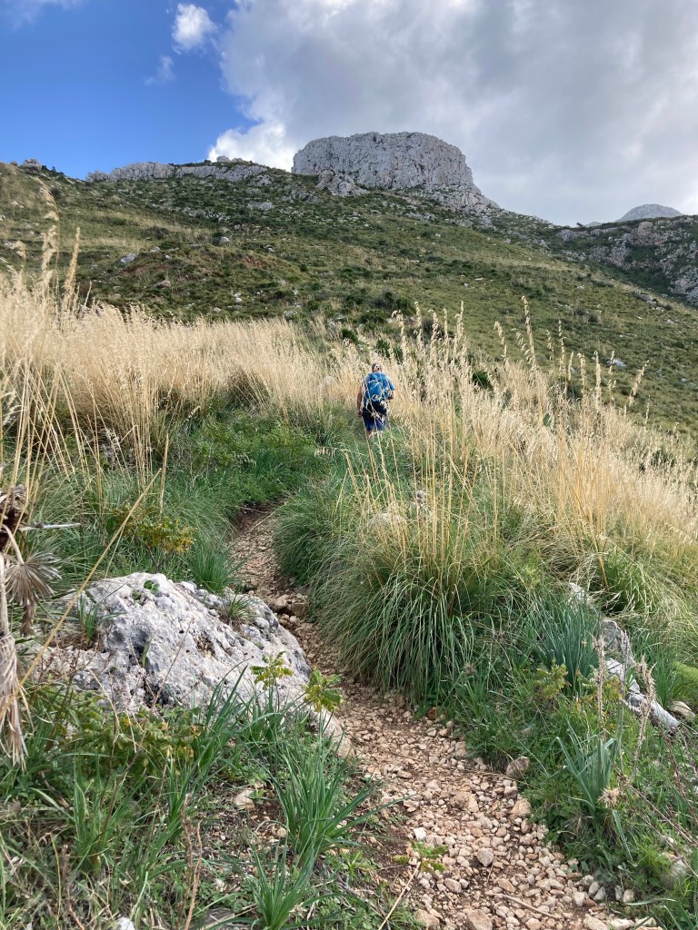Der nächste Tag ist strahlendblausonnigwarm. Ich will da hoch: auf den Pass am Monte – und auf die andere Seite nach Zingaro gucken! Zunächst an Feldern, durch Gärten, vorbei an Hunden und Ziegen wird der Pfad bald steil und ausgesetzt, dank reichlich Serpentinen aber gut zu gehen. Oben ist es immer noch Kurzehose-warm, die Orangen schmecken besonders sonnig, die Aussicht ist grandios. Die Hänge über uns und im Zingaro sind jedoch so kahl und ab mittags schattig, dass wir den Plan Zingaro gerne über Bord werfen: es kann dort nicht schicker sein als hier.