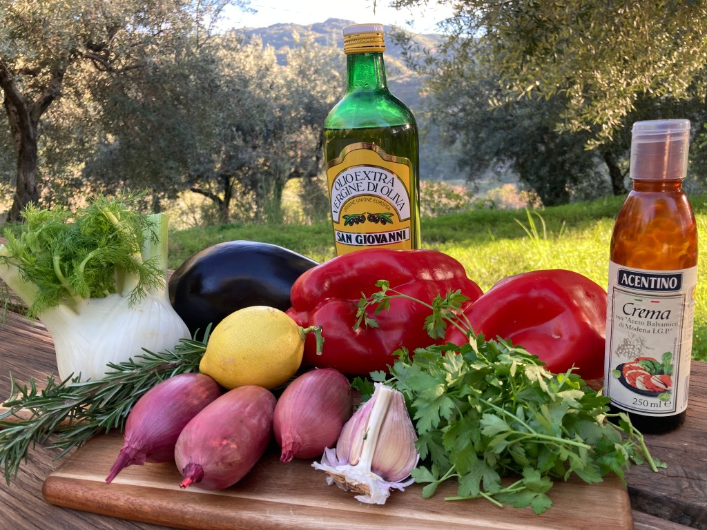Die Vielfalt der frischen kalabrischen Gemüse soll heute mal auf den Grill. Ich habe eine Aubergine (Melanzana), einen Fenchel (Finocchio), eine rote Paprikaschote (Peperoni) und die für Kalabrien typischen roten Zwiebeln (Cipolla Rossa di Tropea) besorgt. Die Zwiebeln haben ein festes, knackiges Fruchtfleisch sehr süßlichem Geschmack. Sie enthalten das natürliche Antibiotikum Allicin. Der Anbau der Zwiebeln beschränkt sich auf einen Küstenstreifen rund um das Capo Vaticano und sie haben eine geschützte Herkunftsbezeichnung. In Kalabrien wird, wegen der Süße, auch eine Zwiebelmarmelade hergestellt.