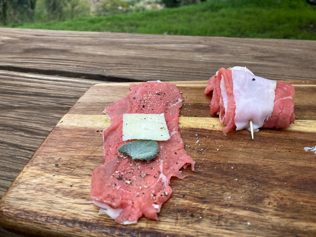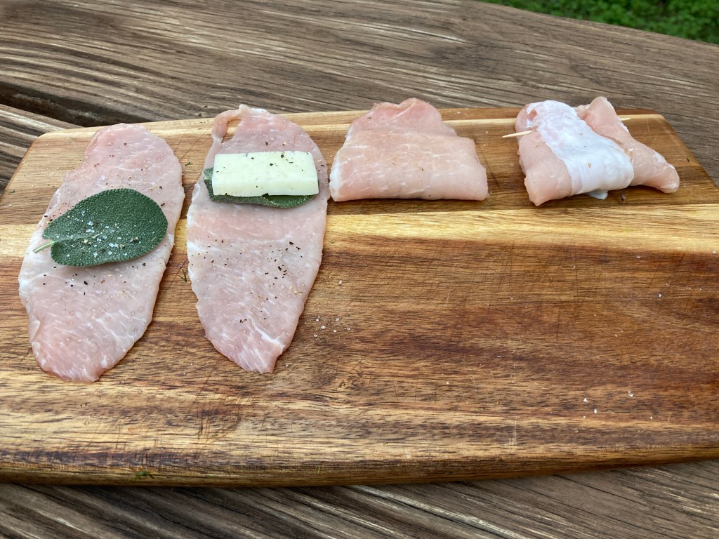 Für den Grill habe ich das Rezept etwas abgewandelt, damit das Fleisch nicht zu trocken wird. Zum einen habe ich Schwein und Rind verwendet, dann habe ich die Schnitzel mit Salbei und einem Stückchen Parmesan /Pecorino belegt, das Ganze zusammengeklappt und mit Lardo umwickelt, dadurch bleibt das Fleisch innen schön saftig.