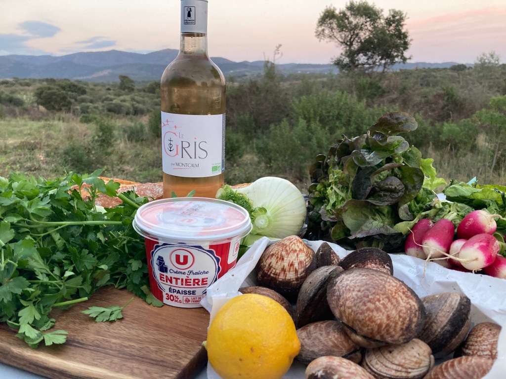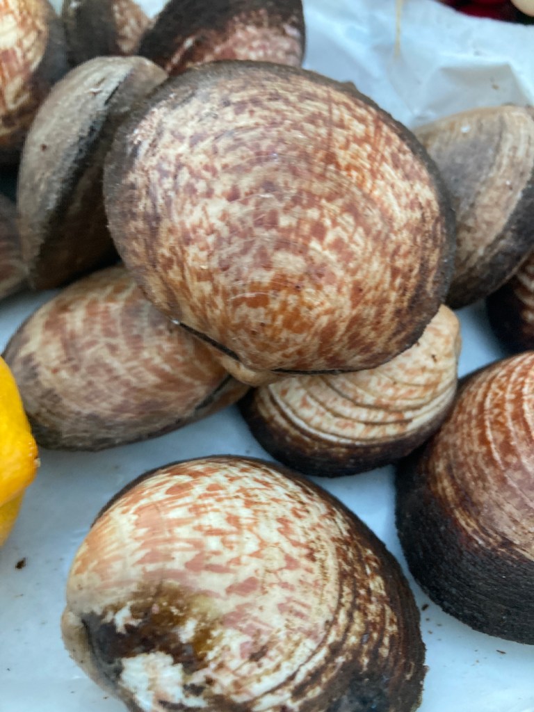 Am Fischstand haben wir Amande de Mer, Meermandel (Gemeine Samtmuschel) bekommen. Diese Muschel, die an der gesamten Atlantikküste von Portugal bis Norwegen und im Mittelmeer verbreitet ist und in einer Tiefe von 20 – 50 m lebt, wird vor allem in Frankreich und Portugal gegessen und sollte auf keiner guten Meeresfrüchteplatte fehlen.