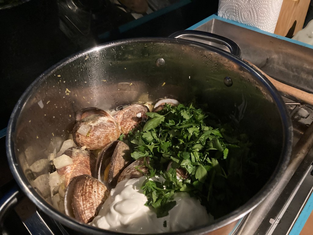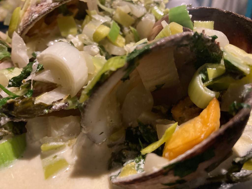 Wenn die Muscheln alle geöffnet und gar sind, die Cremé fraiche, die Petersilie und den Lauch untermischen und kurz mit erwärmen. Der Lauch sollte noch frisch und knackig sein.