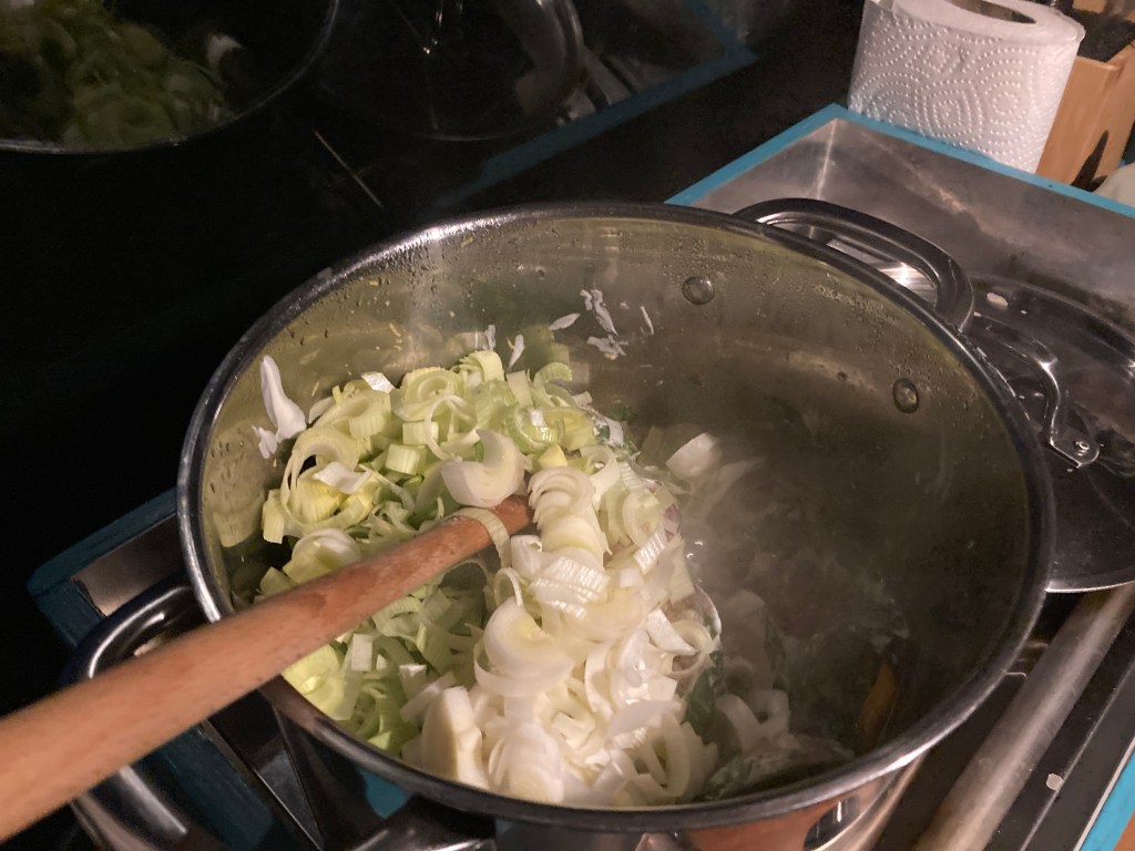 Jetzt die Amandes auf den Sud legen und 10 min köcheln/dämpfen, dabei ab und zu umrühren. In der Zwischenzeit kann man den Lauch in feine halbe Ringe schneiden und die Petersilie hacken.