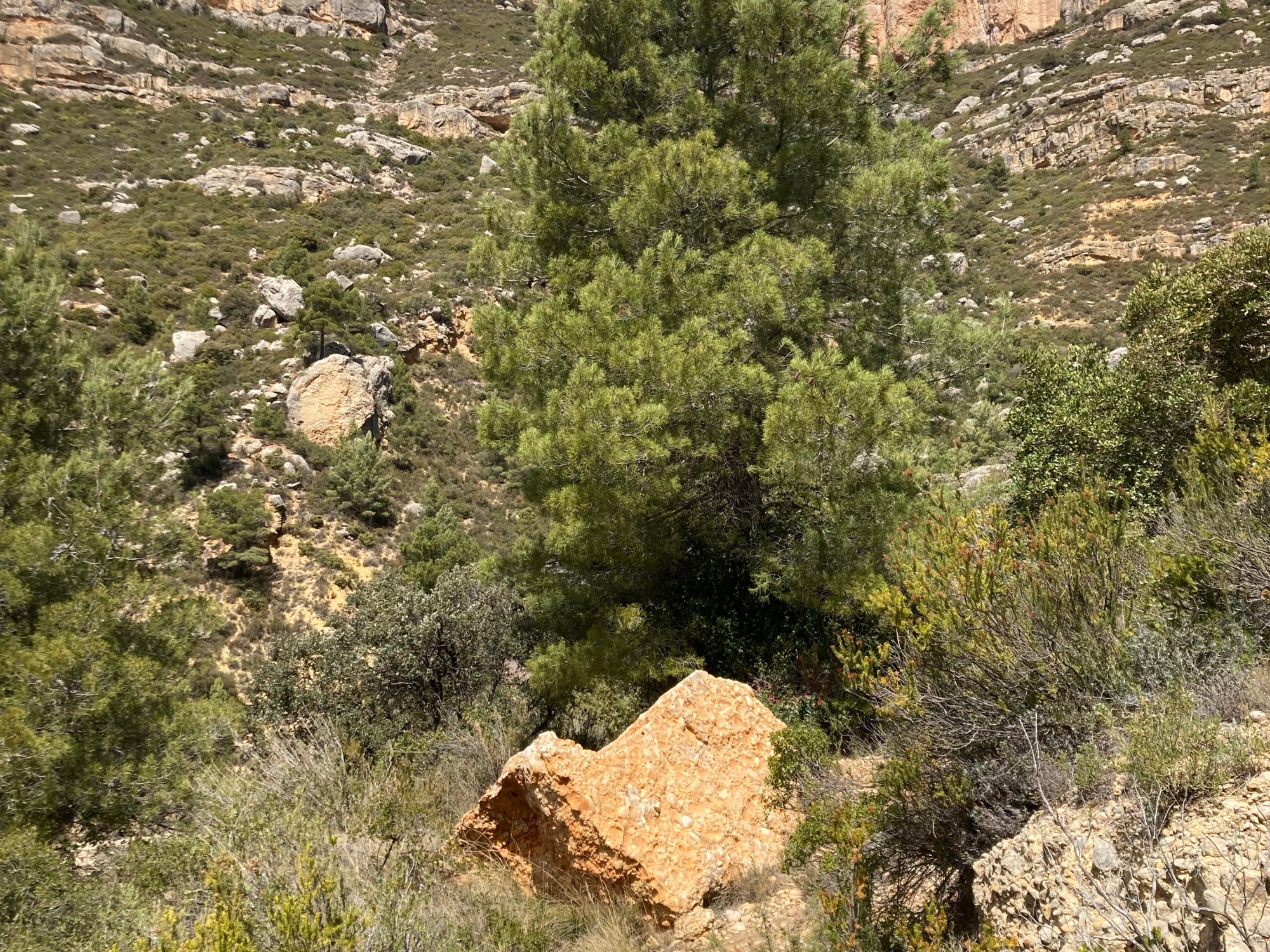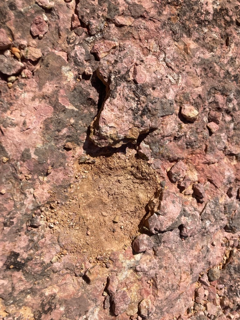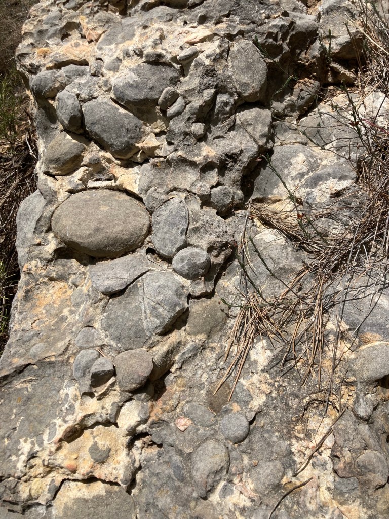 Darüber liegt roter Buntsandstein, der auch auf catalán so heißt. Die oberste Schicht, ganz in hell, sind Kalkstein-Konglomerate, also Kalkstein mit in der Brandung des urzeitlichen Tethys-Meeres rundgewaschenem Kieseln. Diese oberste Lage des Montsant ist im Inneren gelblich, verwittert an den Oberflächen gräulich, auf der sehr karg bewachsenen Oberseite auch rosa (warum nur?). Diese Schichtung, Schiefer – Buntsandstein – Calcit-Konglomerate, ist auch eine zeitliche Sortierung von sehr alt nach nicht so alt. Aufgetaucht und in die Höhe gehoben wurde der Meeresgrund des Tethys-Meeres, als die Iberische Platte tektonischen Stress kriegte, weil sie zwischen der eurasischen und afrikanischen Platte eingeklemmt wurde. Wie so oft werfen sich für uns aus einer (nicht nur geologischen) Antwort wieder 10 neue Fragen auf: warum welche Farbe? Wie kann Wein schieferig schmecken? Ab wann gab es Muscheln und Getier (um den Muschelkalk zu bilden)?