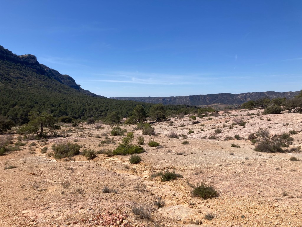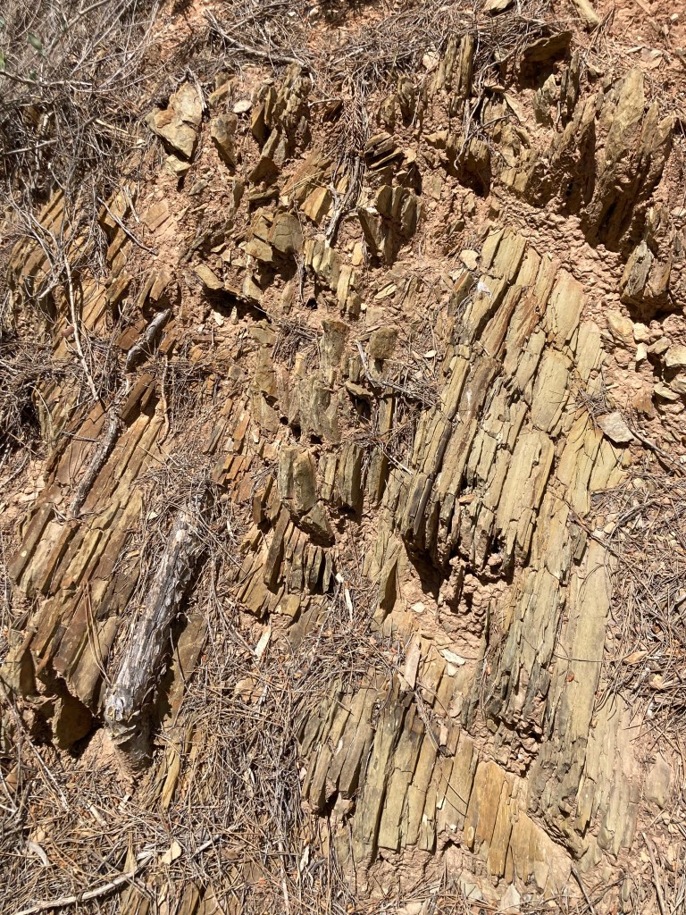 Rückblick zum Montsant, ein Vorküstegebirge im südlichen Katalonien: auf unserer Abschluss-Wanderung über dem Kloster von Escaladei wird uns nochmal klar, in was für ein geologisches Wespennest wir hier gestoßen haben. Was für eine Fundgrube für unser geologisches Unwissen! Das Montsant besteht – zumindest im sichtbaren Teil – überwiegend aus Sediment-Gestein. Zu unterst, z.B. in den tieferen Tälern des Priorat, gibt es zwei Sorten Schiefer, feines Tonsediment, auf dem sich der Prioratwein pudelwohl fühlt.