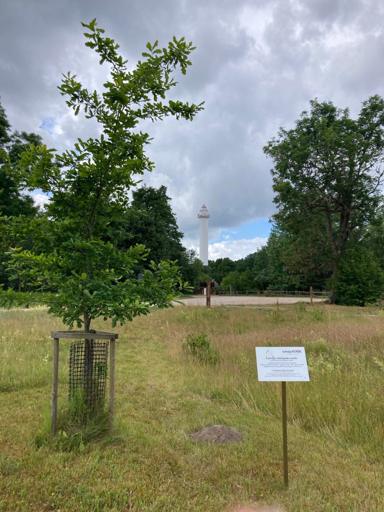 Über Miķeļtornis ragt der höchste Leuchtturm des Baltikums. Zum dritten Mal (2x in 2018) steuern wir den strandnahen Campingplatz Miķeļbāka an. Hier gibt es viel Platz, frisch gezapftes Bier und wenn genug los ist / wäre auch etwas zu essen. Und Klönschnack. Das „Dorf“ besteht aus ein paar Häusern mit Kirche und einem neuen Seefahrsdenkmal. Hier finden wir die 2. der 100 Geburtstagseichen.