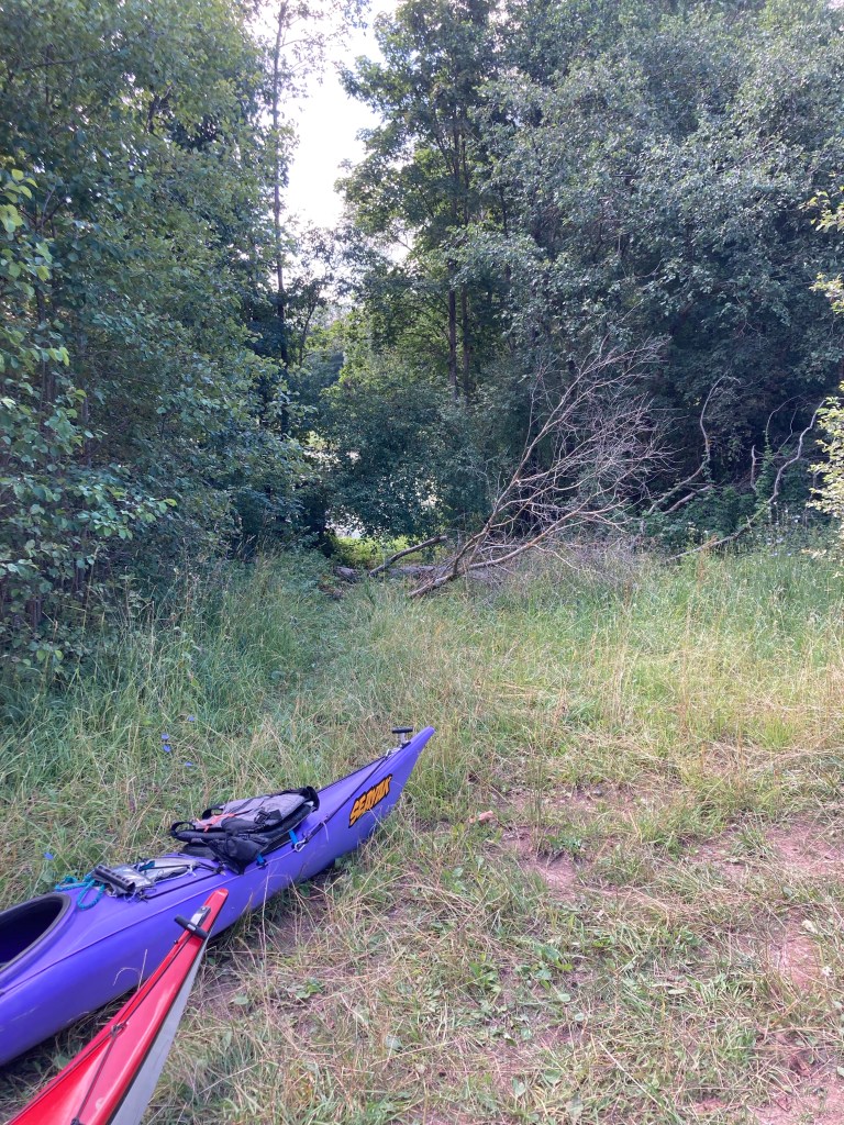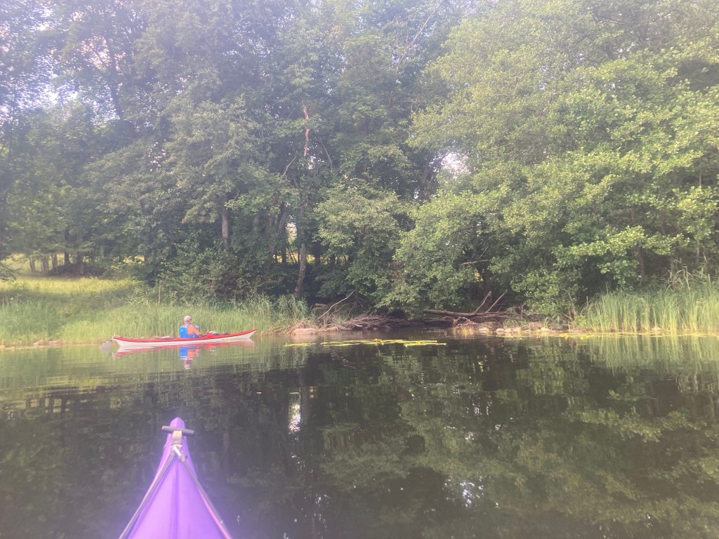 Wir kehren aber um und paddeln weiter gegen den Uhrzeigersinn und mit dem Strom der Dubna zurück in den Carmins, machen noch ein Picknick, wo es schon mal so einen schön angelegten Platz dafür gibt und daddeln an dem schilfigen und zum Wald steil ansteigenden Ufern (=> tiefer See?) entlang zurück.