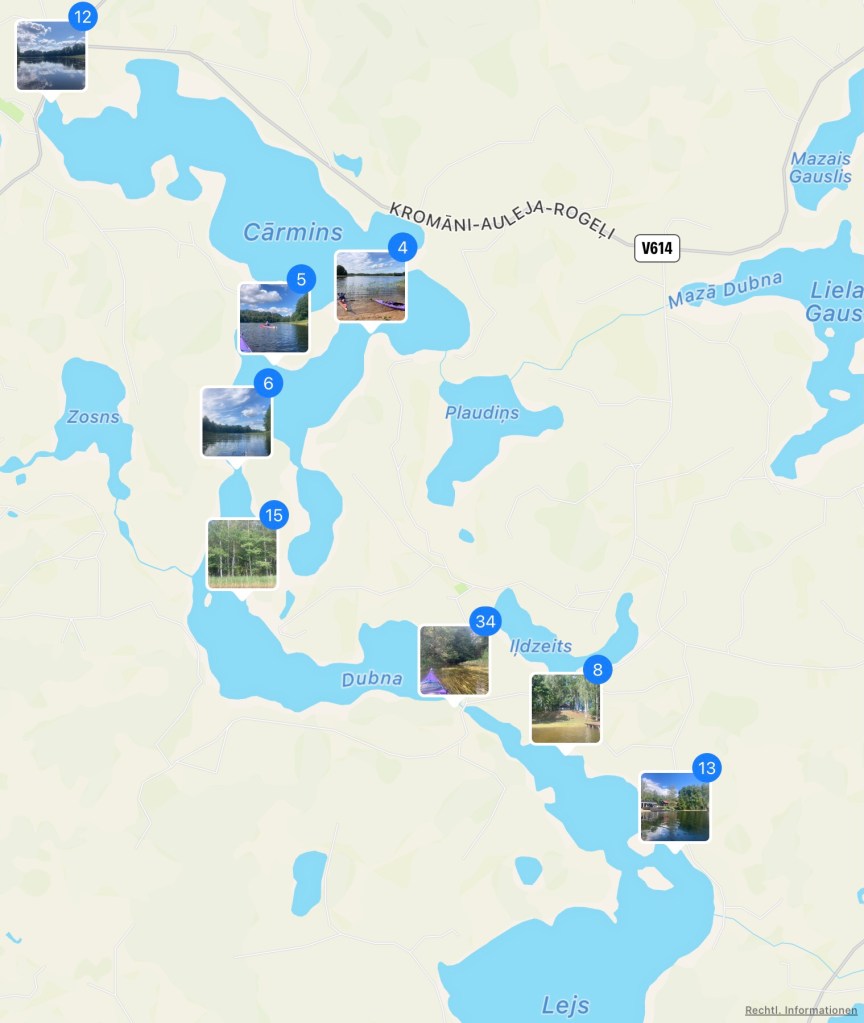 Die nächste Seenerkundung ist der Mittelteil der “Latgale-6-Seen-Tour“: die Seen Cārmins und Lejs sind mit dem Fluss (Rinnsal?) Dubna verbunden. Die Seenkette liegt grob in NW-SO-Richtung, die Dubna schlägelt sich von O nach W.
