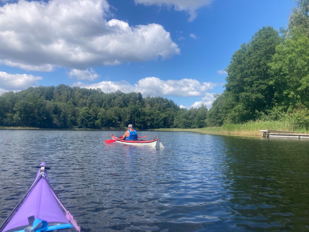 Die Fließgeschwindigkeit der Dubna ist gegenan-paddelbar, sodass wir mühelos in den Lejs fortsetzen. Hier umrunden wir zwei Inseln auf dem Weg zum zu erforschenden Dubna-Zufluss. Dieser liegt direkt neben einem schicken Hotel- und „Erholungskomplex“ (wir haben auch bald Erholungskomplexe). Müssten wir den Weg in den nächsten See, den Ārdavs, fortsetzen, wäre auf der entgegenkommenden Dubna kein (Baum-)Hindernis in Sicht.