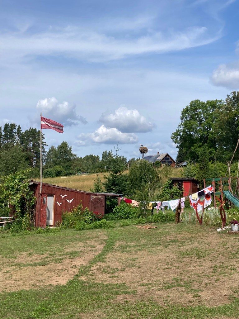 Auf dem Ferienhof (in Italien würde man es agriturismo nennen) „Zemeņu Krastiņu“ am See Geraņimovas Ildzs werden wir herzlich willkommen geheißen. Unter den Augen einer Storchenfamilie, umsorgt von einer herzlichen Gastgeberin (es gab erstmal Tee mit Zubehör) und mit viel Platz für alle Gäste (wir sind tatsächlich mal nicht alleine) lässt es sich zwischen Ferienhütten und Badesteg sehr gut aushalten.