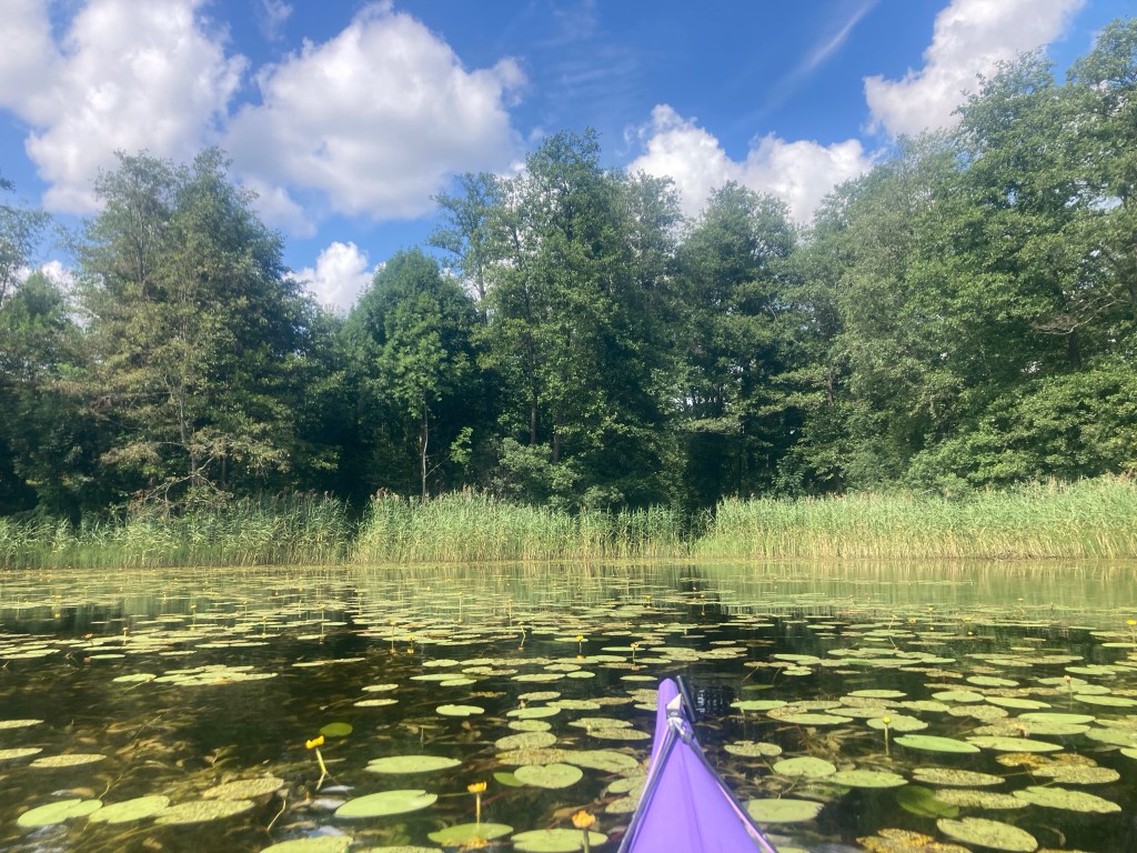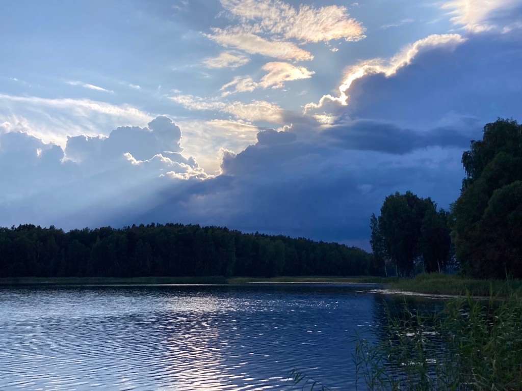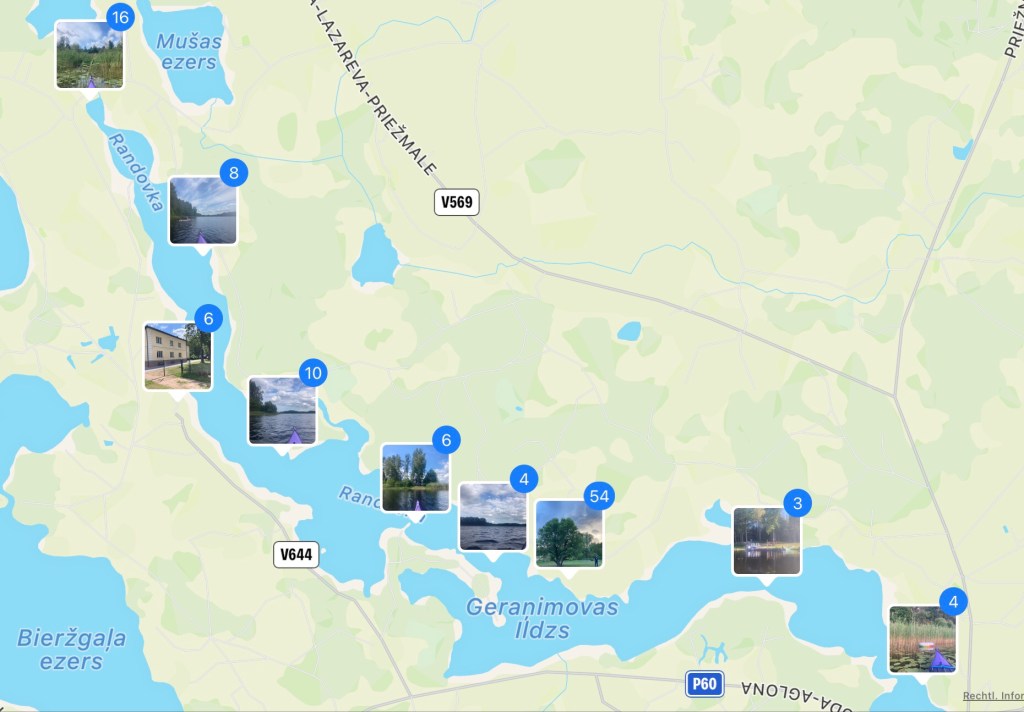 Der See, lang, schmal und bis zu 44m tief, lädt auf sauberstem Wasser zu Kajak-Erkundung in zwei Richtungen ein. Wir finden viel Schilf, am NW-Ende eine versteckte Umtrage in den Rušons und ein paar wenige Rastplätze, u.a. hinter der Schule(?) von Geraņimova und an der offiziellen Badestelle von Priežmale am O-Ende des Sees. Zwischen den Paddelrunden und danach eindrucksvolles Wetter mit Himmel – die zum Glück achterlichen Böen noch auf See, die Schauer an Land.