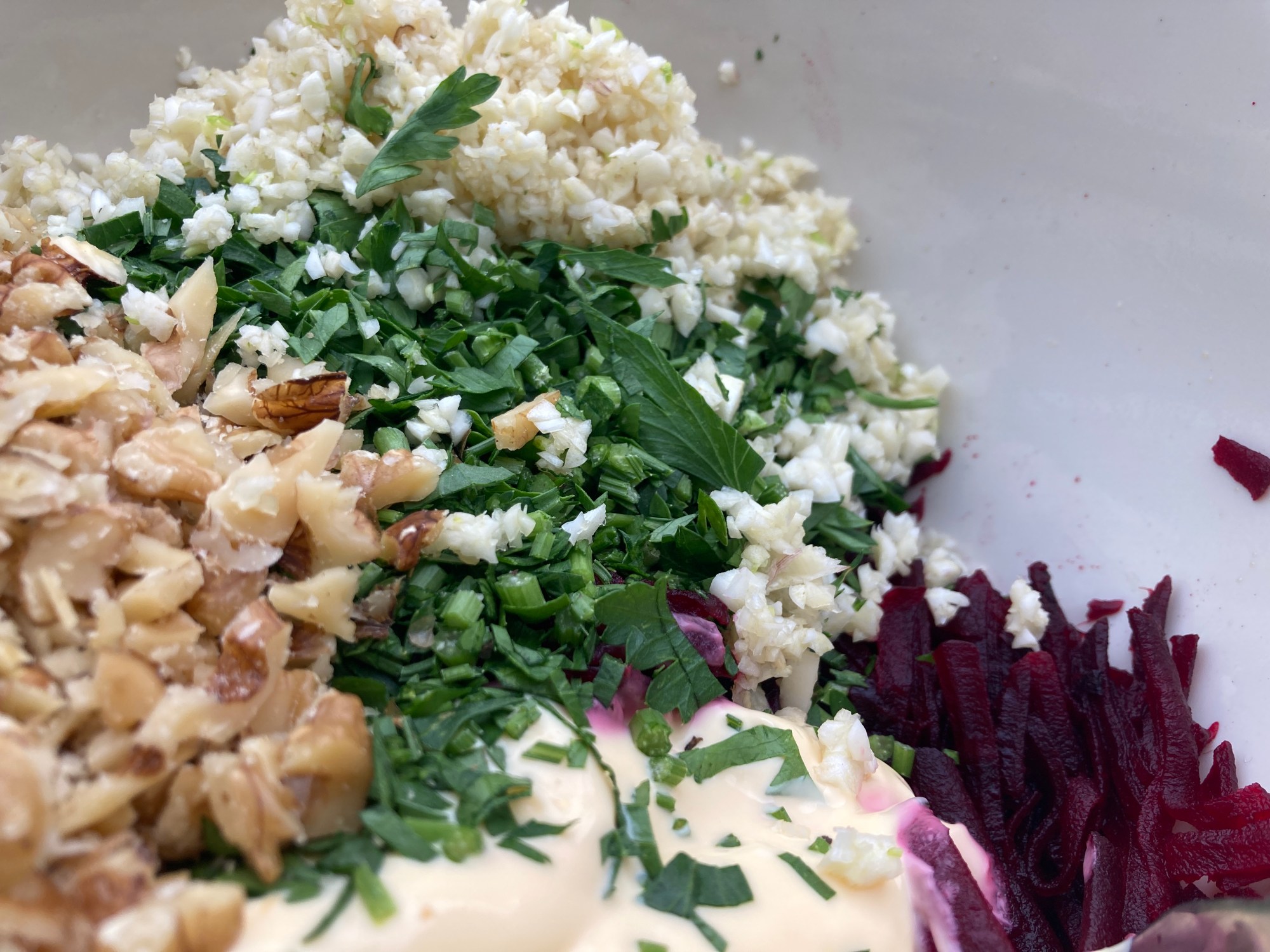 Die rote Bete grob in die Salatschüssel reiben. Die Petersilie nicht zu fein hacken und dazu geben, wenn die Stengel nicht allzu dick und fest sind, kann man die gerne mit hacken. Die Walnüsse ebenfalls grob hacken und dazu geben.
