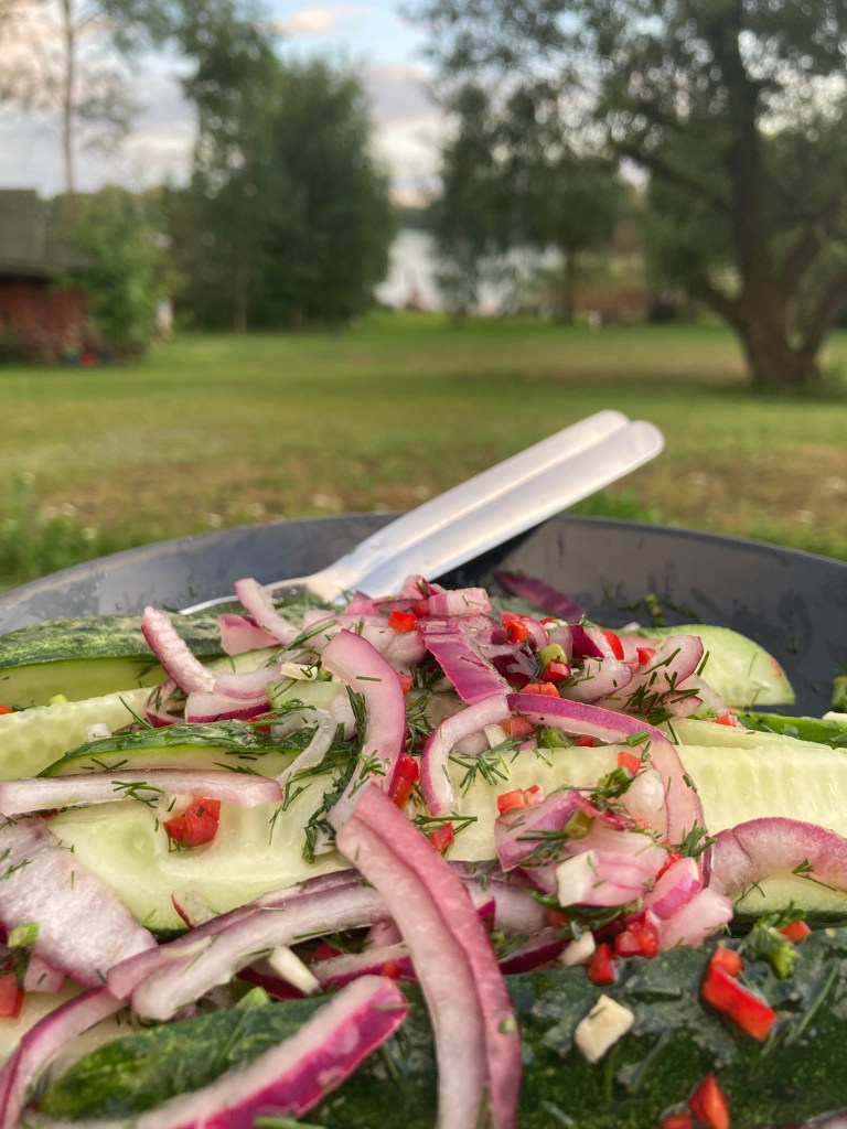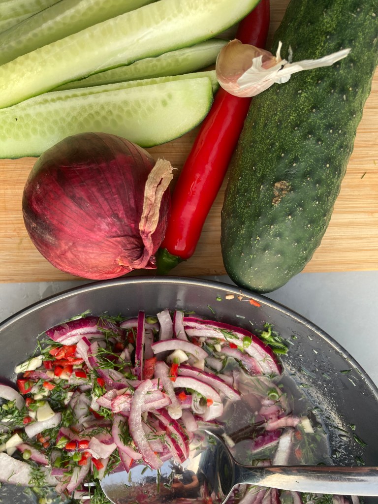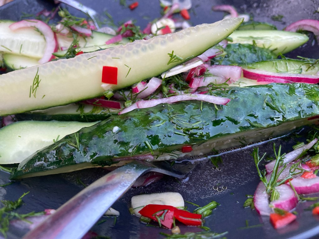 Dieses Rezept geht am besten mit Einlegegurken, die man hier im Baltikum im Sommer überall bekommt. Durch die etwas festere Schale werden sie beim marinieren nicht so schlaff wie Schlangengurken und bleiben schön knackig.